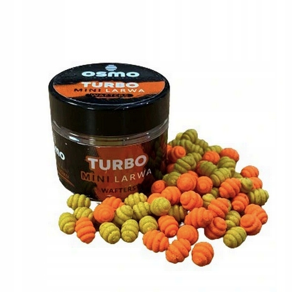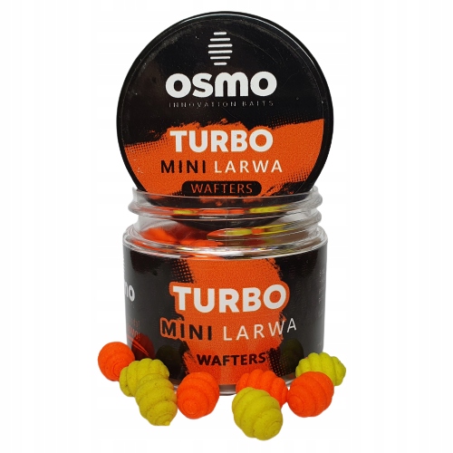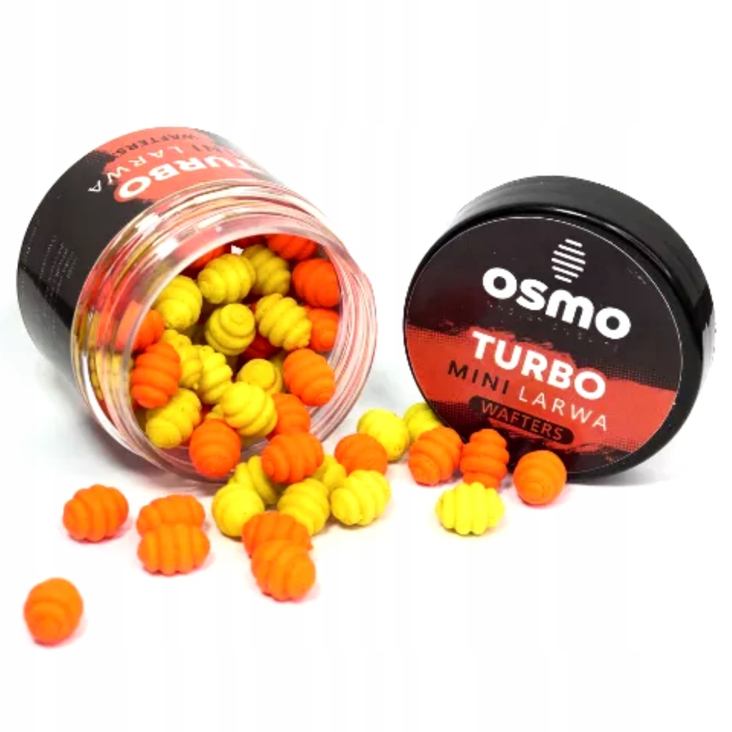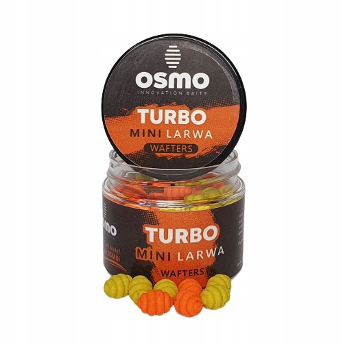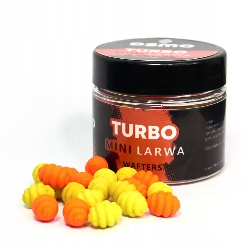 OSMO Mini Larwa Wafters to innowacyjne przynęty charakteryzują się wyjątkowym kształtem oraz małym 7mm rozmiarem. Turbo to zapach znanej gumy balonowej w kolorach żółtym i pomarańczowym Jak wszystkie mają sporą wyporność jak na waftersy, haki które je balansują (ważne: balansujemy larwy hakami nie bagnetami) to rozmiary 8, 10, 12. Wyporność to dla OSMO bardzo ważna sprawa i tym wyróżniamy się na rynku przynęt, uważamy że w naszych wodach, gdzie karpie dorastają do sporych rozmiarów, stosowanie odpowiednio dużych haków to podstawa.