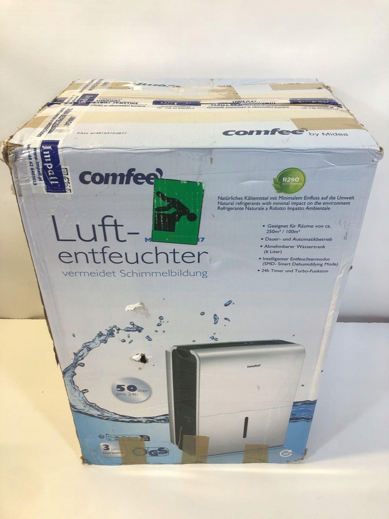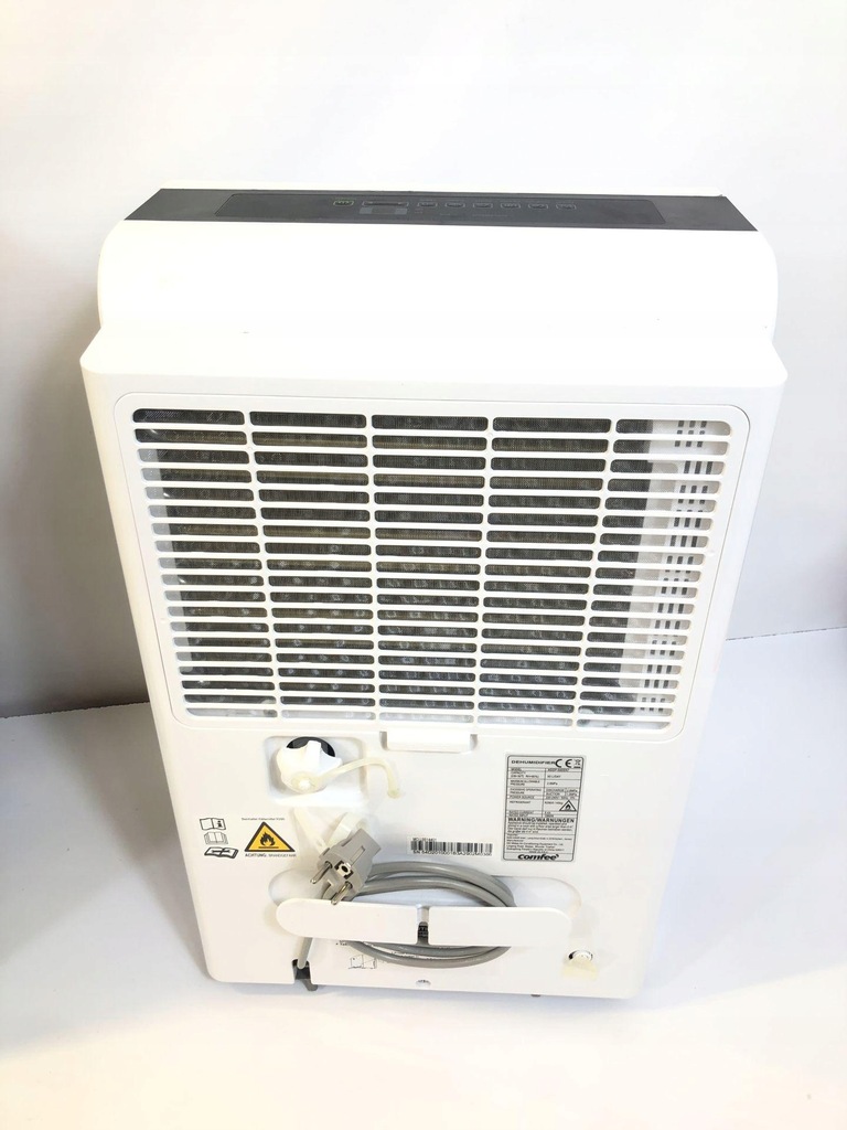 Brak instrukcji.Posiada certyfikat CE.Urządzenie nie sprawne,brak czynnika chłodniczego w sprężarce,za małe ciśnienie.Nie zbiera wody,nie osusza.Widoczne liczne slady uzytkowania w postaci rys,śladów po kleju i zabrudzen.