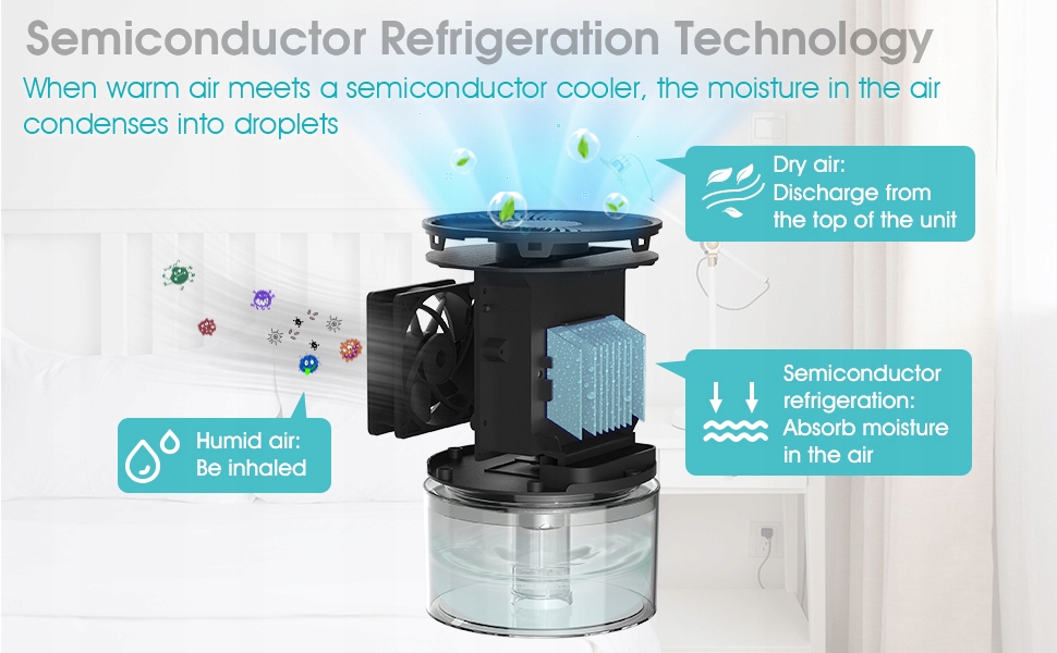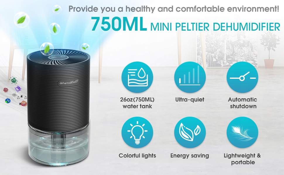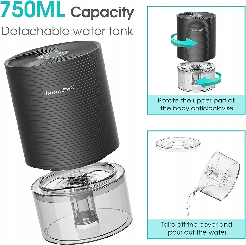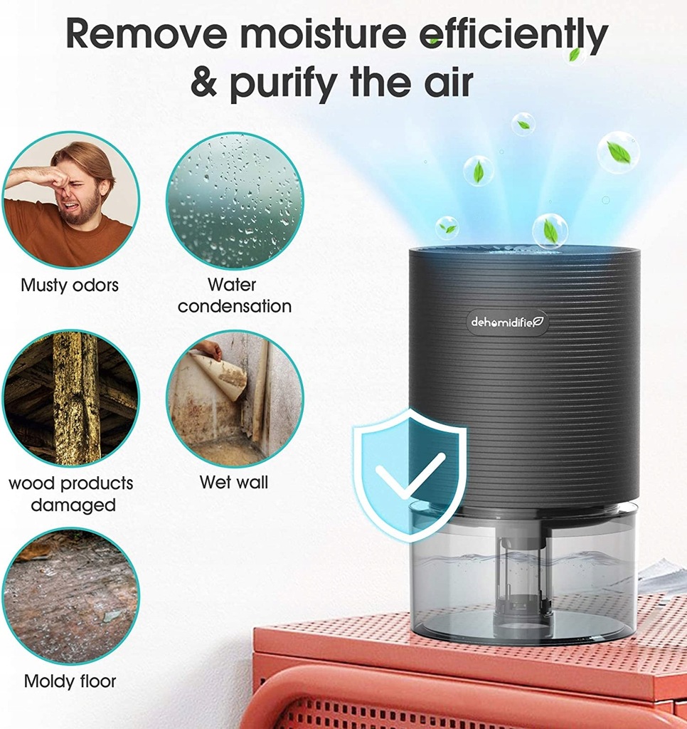 【Dobry pomocnik osuszania】 Nasz osuszacz wykorzystuje określone elementy półprzewodnikowe do skraplania wilgoci z powietrza do postaci wody. Kropelki wody płyną po elemencie półprzewodnikowym i gromadzą się w zbiorniku na wodę o pojemności 750 ml. Może skutecznie poprawić jakość Twojego życia.