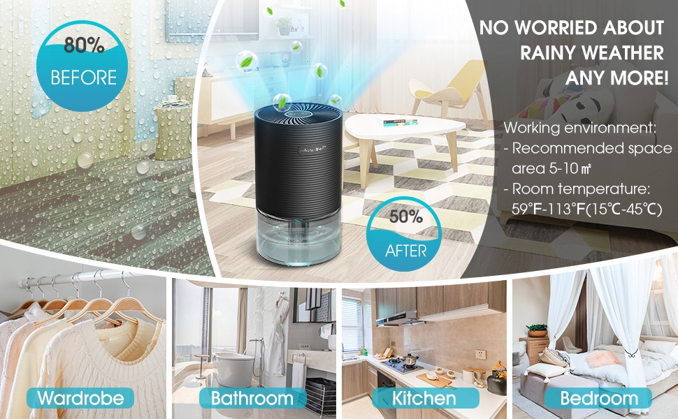 【Przenośny i lekki】 Nasz osuszacz ma niewielkie rozmiary, a masa ciała to tylko 750 g, łatwo go nosić w dowolnym miejscu. Również wygodny w użyciu w sypialni, łazience, garderobie, kamperze i innych małych przestrzeniach.