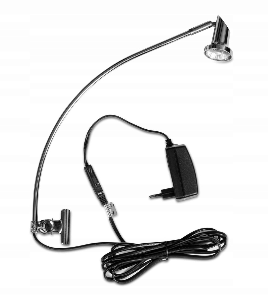 Lampka halogenowa do podświetlenia Roll-upa idealnie podkreśli wydrukowaną grafikę lub doświetli ją w zaciemnionym pomieszczeniu. Lampka posiada specjalny klips umożliwiający szybki montaż na maszcie roll upu, od tyłu wydruku.