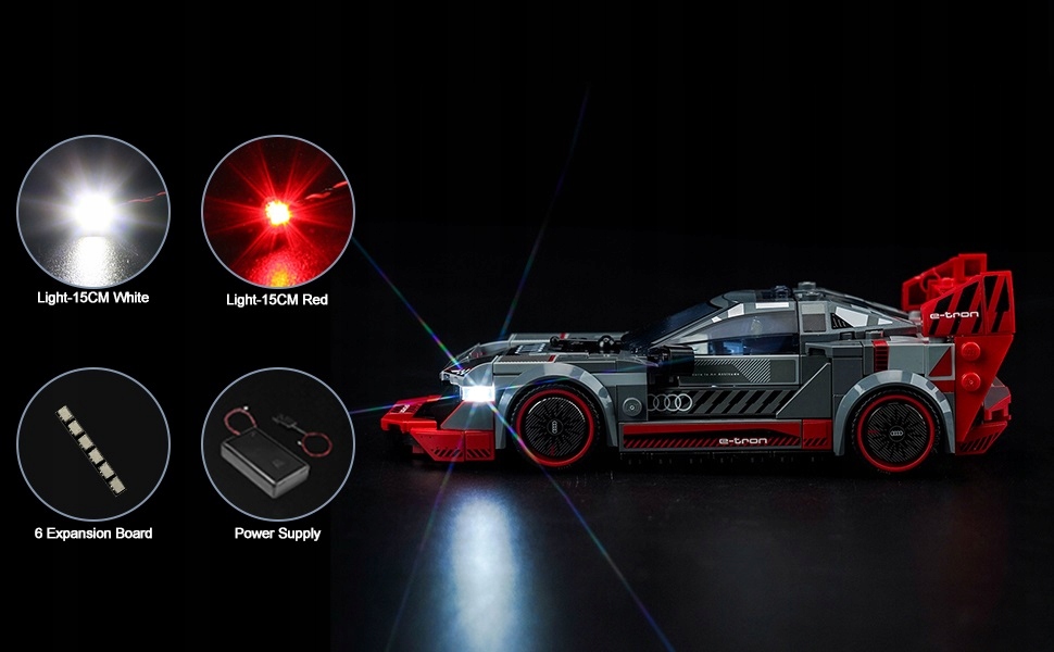 W zakres dostawy wchodzi kabel USB i komora baterii. Diody LED do Speed Champions Audi S1 e-tron Quattro zabawki samochodowe mogą być zasilane przez powerbank, ładowarkę, gniazdo USB, laptopa lub inne urządzenie z portem USB. Można go również używać z baterią (baterie nie wchodzą w zakres dostawy).