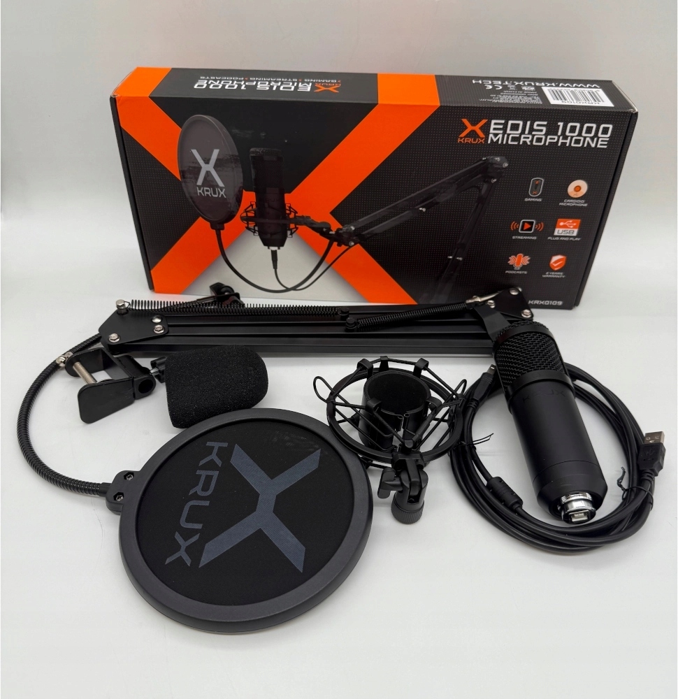 Dobierając podzespoły, które ostatecznie trafiły do wnętrza mikrofonu EDIS 1000 firma Krux kierowała się opiniami graczy ich stanowiskami oraz miejscami z których tworzą swoje streamy. Finalnie, części z których składa się mikrofon KRUX EDIS 1000 USB dobrano tak, aby maksymalnie redukować odgłosy otoczenia w niewyciszonych i stosunkowo małych pomieszczeniach, jednocześnie zachowując maksymalną jakość rejestrowanego źródła dźwięku, znajdującego się blisko mikrofonu.