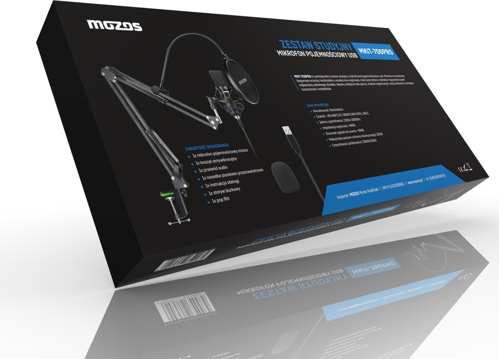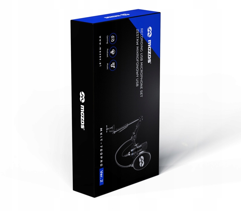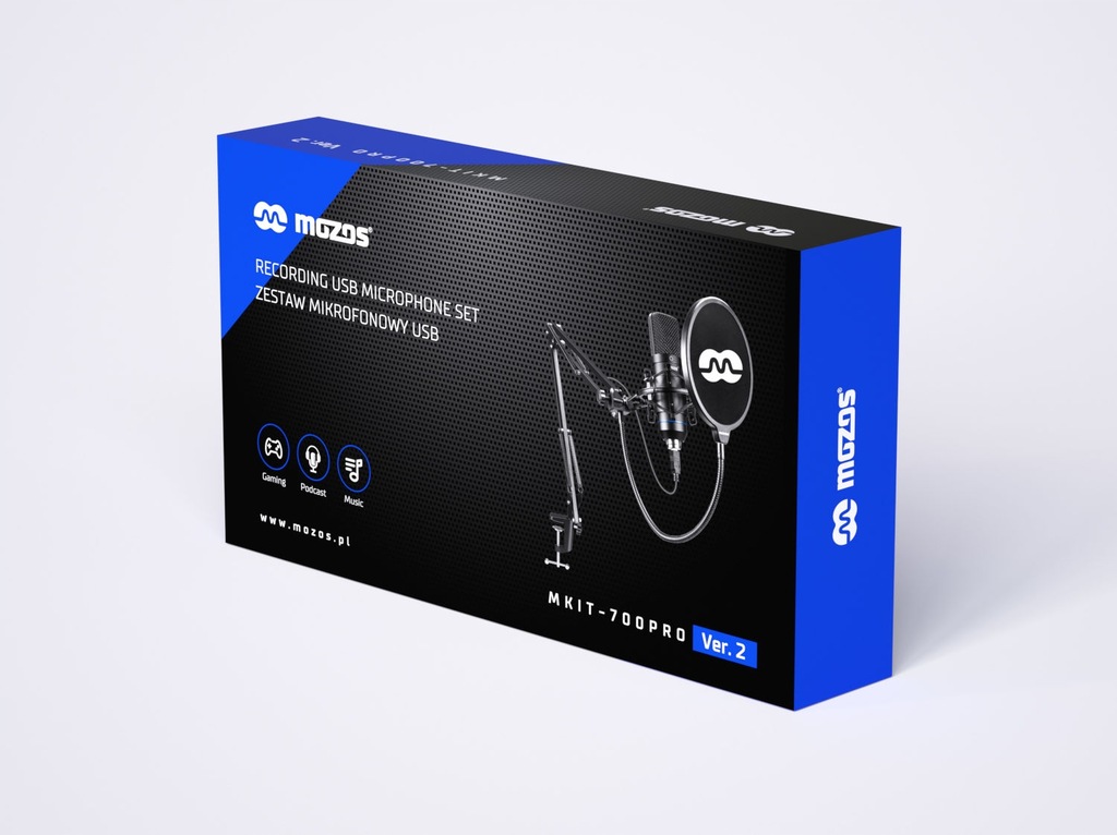Przede wszystkim zastosowano mikrofon z serii mkit-900pro. To duży skok jakościowy. Jedyna różnica między mikrofonami to kolor oringa (niebieski zamiast czerwonego). Mikrofon posiada również malowanie lakierem premium który jest bardziej odporny na zużycie i zarysowania. Zmieniono też zacisk biurkowy który tym razem występuje w wersji odlanej z jednego kawałka stali. To ogromnie wpływa na jego wytrzymałość. Dopracowano opakowanie z zewnątrz jak i wewnątrz. To wszystko aby twój mikrofon był bezpieczny w czasie transportu. Główna różnica między zestawem mkit-900pro oraz mkit-700pro to sposób montażu. W modelu 900pro mamy statyw biurkowy z regulacją wysokości natomiast w modelu 700pro zastosowano ramię biurkowe/wysięgnik. Urządzenie jest bardzo proste w montażu. Aby podłączyć mikrofon do komputera wystarczy jeden przewód wpiąć do mikrofonu a z drugiej strony do portu USB w PC. System automatycznie odnajdzie mikrofon i zainstaluje sterowniki.