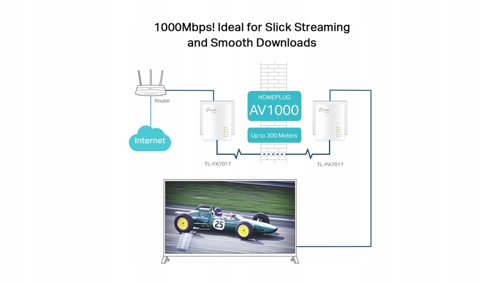 Zestaw transmiterów TL-PA7017 KIT z zaawansowaną technologią Home Plug AV2 zapewnia stabilny przesył danych z prędkością sięgającą nawet 1000Mb/s* na obszarze obejmującym 300 m. Urządzenie eliminuje zakłócenia w transmisji, dlatego jest świetnym wyborem dla wymagających zastosowań, takich jak np. strumieniowanie plików wideo w rozdzielczości HD, gry online czy pobieranie dużych plików.