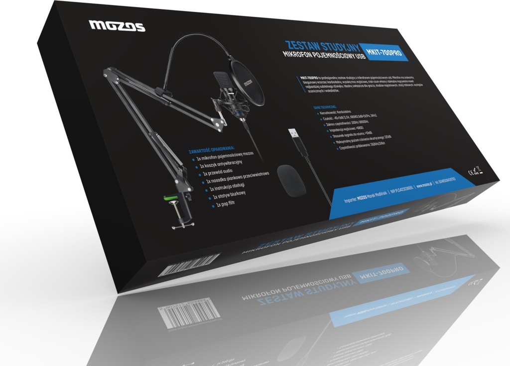 Mozos MKIT-700PRO V2 to profesjonalny zestaw studyjny z mikrofonem pojemnościowym dającym możliwość zabawy dla początkujących użytkowników. Mikrofon ma znakomity wzorzec kardioidalny, wysoką moc wyjściową, niski szum własny i dokładne nagrywanie nawet najbardziej subtelnego dźwięku. Idealny zwłaszcza dla graczy, studiów nagraniowych, stacji radiowych, występów scenicznych i wokalistów.