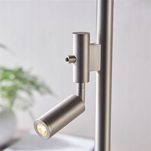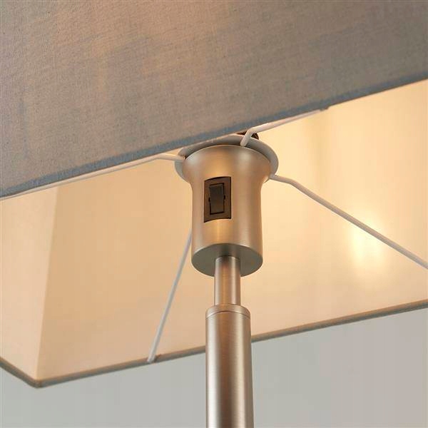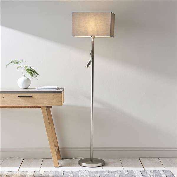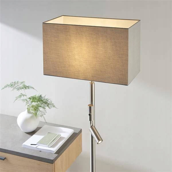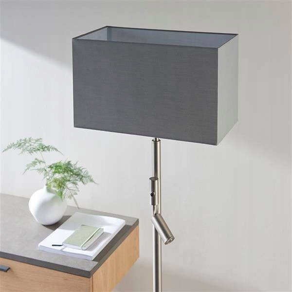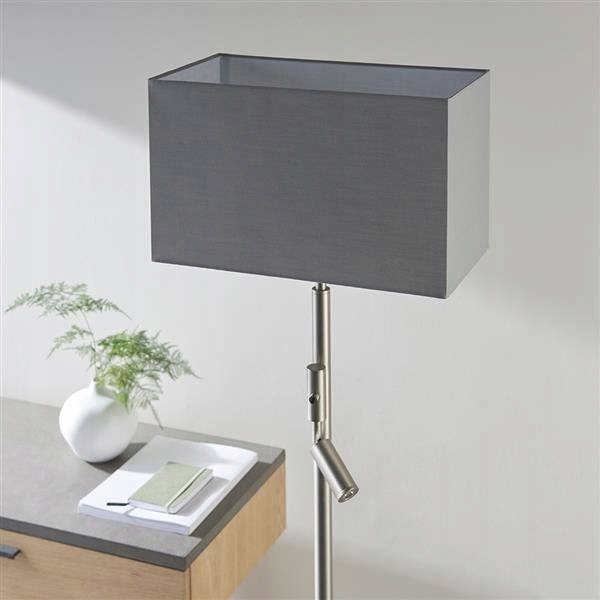 Nowoczesna wewnętrzna lampa podłogowa z podwójnym źródłem światła wykończona matowym niklem, połączona z prostokątnym kloszem z tkaniny w kolorze chłodnej szarości. Wyposażona w łatwo dostępny włącznik/wyłącznik oprawy lampy oraz uniwersalną lampkę do czytania LED włączaną niezależnie dla wygody.