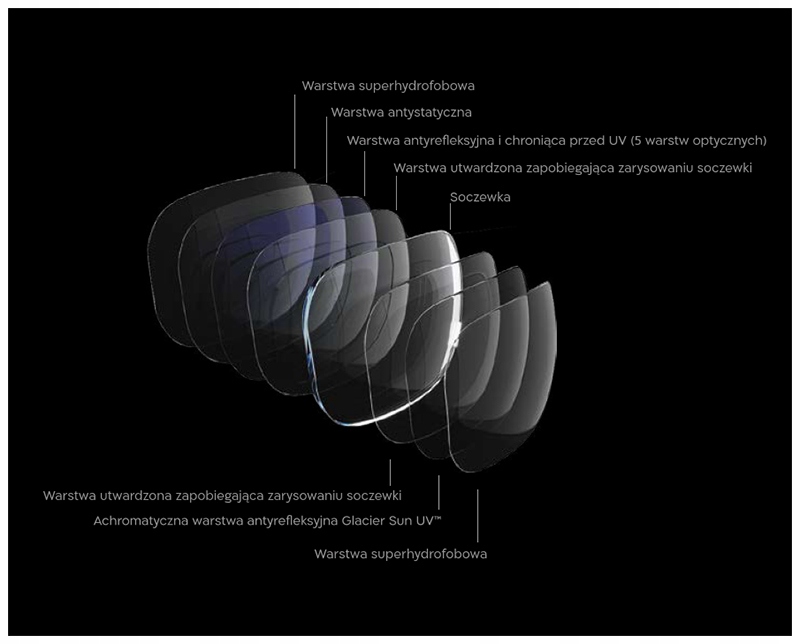 - Glacier Sun UV™ - powłoka, która zachowuje i nie zmienia barwy soczewek - posiada neutralny odcień własnego odbicia szczątkowego (kolor odblasku powłoki jest bezbarwny), chroni jednak kolor przed wyblaknięciem; o zwiększonym poziomie ochrony przed UV – pochłania niebezpieczne promieniowanie odbite, minimalizuje efekt olśnienia; bardzo trwała o zwiększonej odporności na zarysowania, łatwa w czyszczeniu, bardzo odporna na działanie wody, zaplamienie, zatłuszczenie i odciski palców