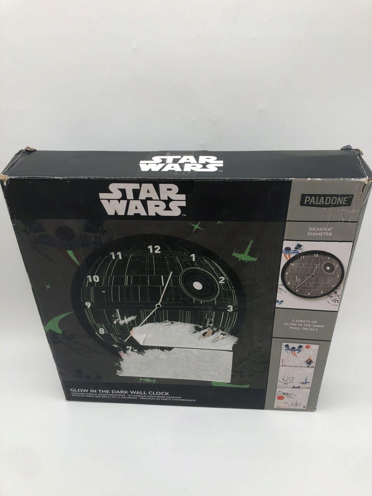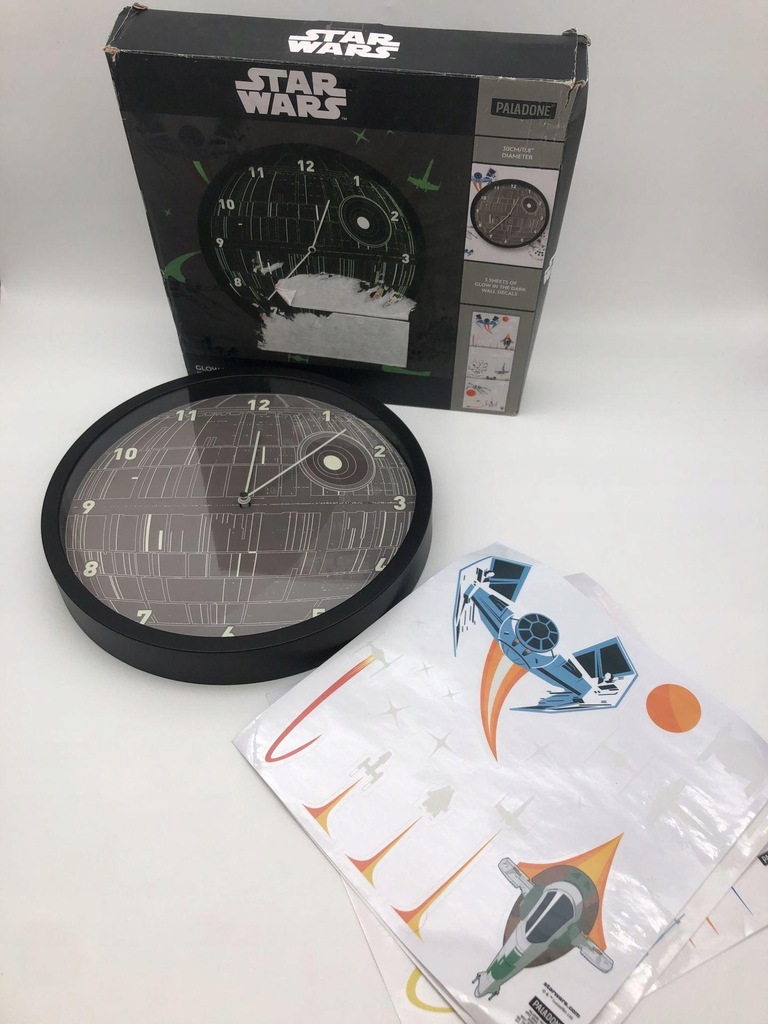 ŚWIECI W CIEMNOŚCI: Ten zegar ścienny Gwiazda Śmierci z Gwiezdnych Wojen sprawia, że ciemna strona jaśnieje. Świeci w ciemności i rozświetla pokój w nocy - ekscytujący dodatek do atmosfery Sithów. Zawiera świecące naklejki ścienne.