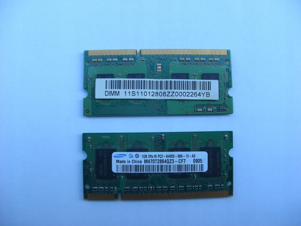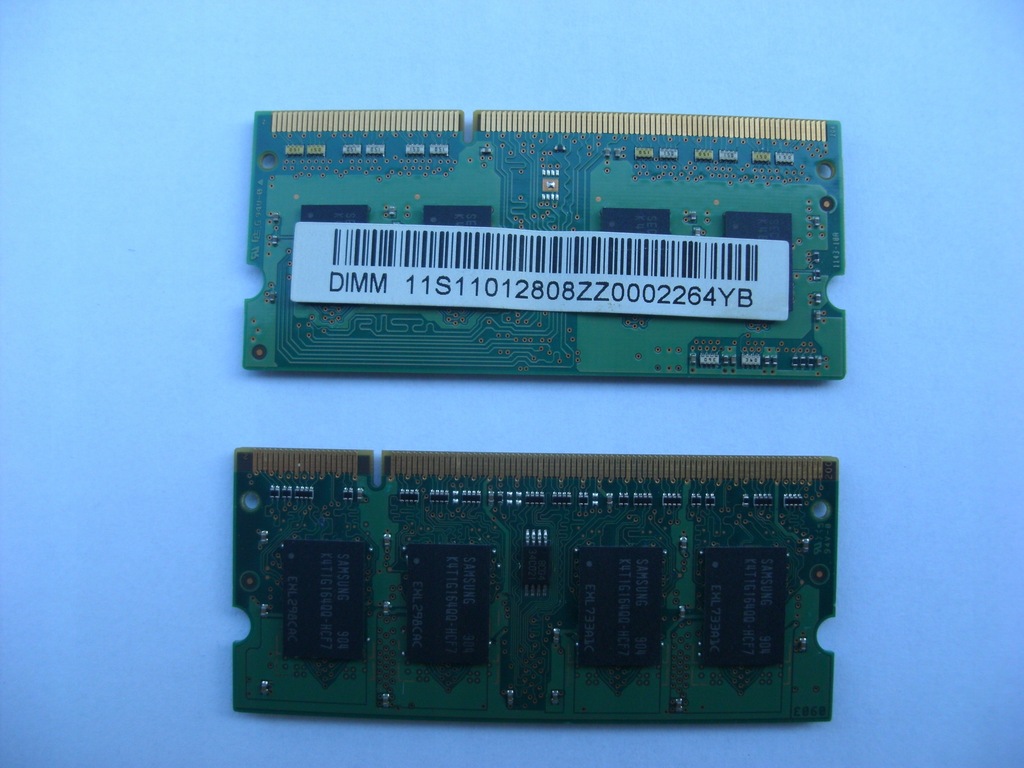 Kość DDR2 została wymontowana z netbooka Samsung NC10 i w chwili demontażu była w pełni sprawna. Kość DDR3 została kupiona przez pomyłkę i okazało się, że nie pasuje do tego modelu. Od demontażu obie były przechowywane w szafie w opakowaniu zastępczym widocznym na zdjęciu.