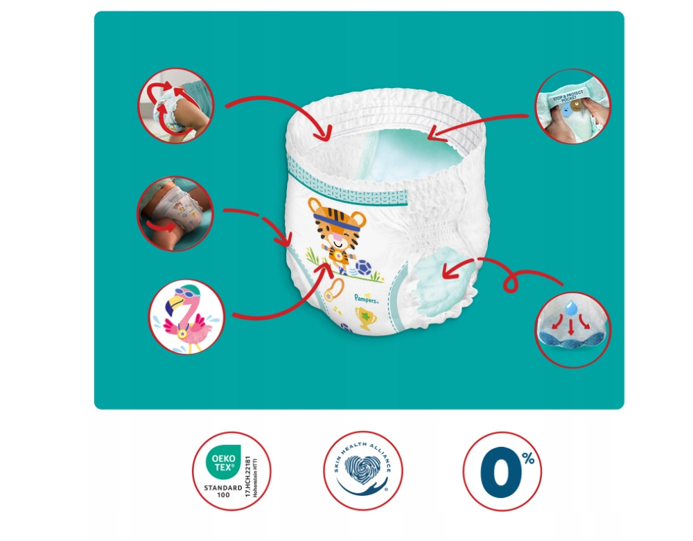 ✅ Pieluchomajtki Pampers Pants oferują pełne dopasowanie 360°, co zapobiega przeciekaniu i gwarantuje wygodę przez całą dobę. Elastyczna taśma wokół talii umożliwia idealne dopasowanie do brzuszka dziecka. Wysokiej jakości superchłonny wkład szybko wchłania wilgoć, utrzymując skórę dziecka suchą. Podwójna osłonka wokół nóżek zapobiega przeciekaniu w newralgicznych miejscach. Są również przebadane dermatologicznie, co zapewnia bezpieczeństwo skóry dziecka.