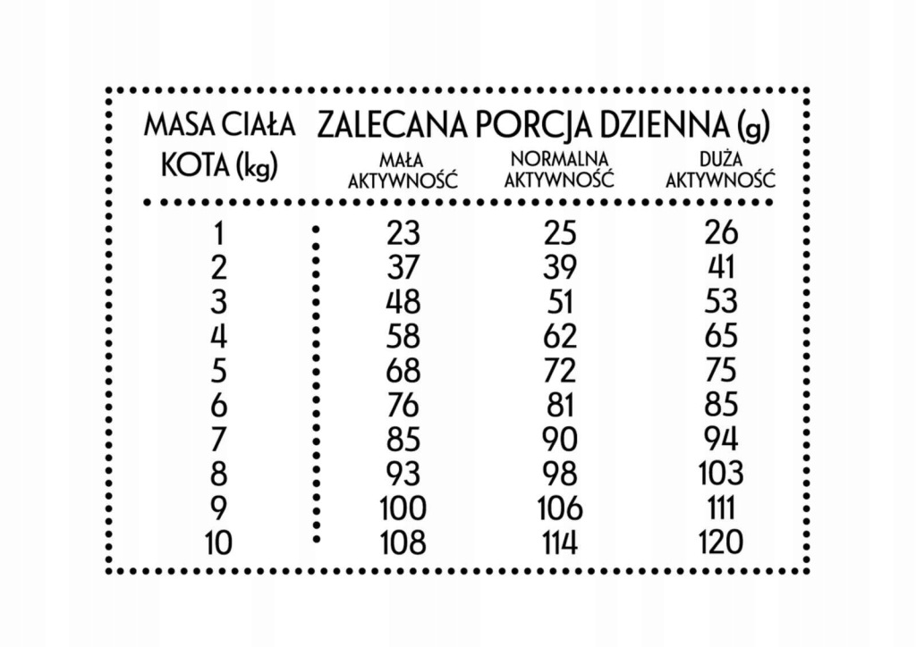Masa kotaDzienne dawkowanie (g)Mała aktywnośćNormalna aktywnośćDuża aktywność1 kg2325262 kg3739413 kg4851534 kg5862655 kg6872756 kg7681857 kg8590948 kg93981039 kg10010611110 kg108114120
