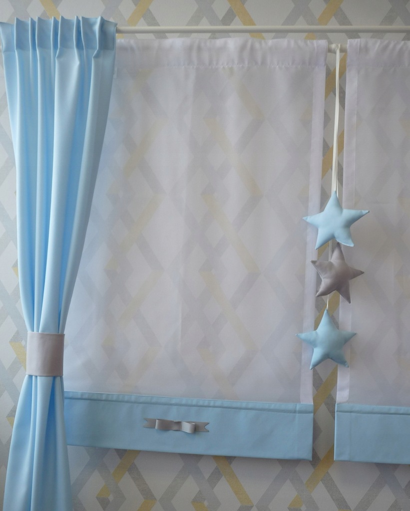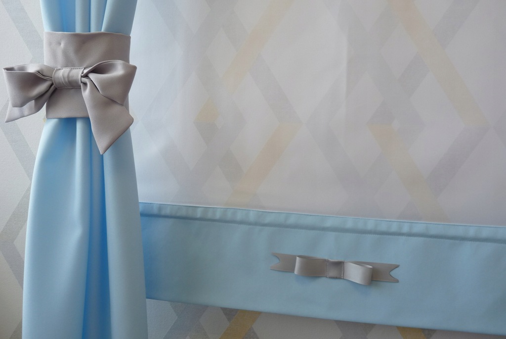 Panel ekran firanka roleta dziecięca - zawieszany na karnisz. Panel o stałej wysokości . Tkanina woal premium biały, dodatek kolorystyczny - błękit poliester usztywniony na flizelinie. Ozdobiony uroczą kokardką w kolorze szarości. Na dole uszyty tunel w celu włożenia obciążnika, który dostajesz w zestawie.