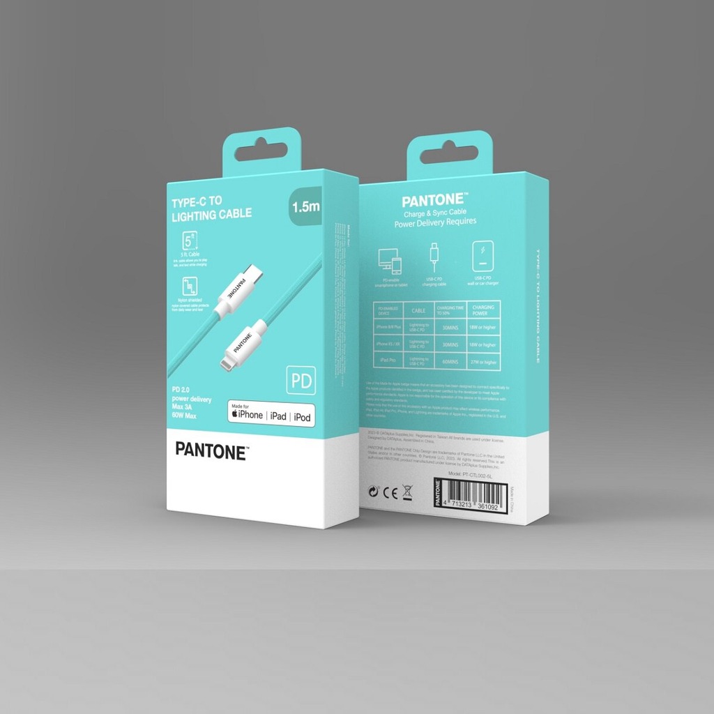 PANTONE CTL002 to kabel MFI wyposażony w złącza Lightning - USB-C. Kabel został zaprojektowany w zgodzie z paletą barw tak aby wyróżnić go na tle innych produktów. Nylonowy oplot zagwarantuje bezpieczeństwo podczas użytkowania kabla oraz jego długą żywotność. Długość 1,5m wystarczy na umiejscowienie go w każdym potrzebnym miejscu.