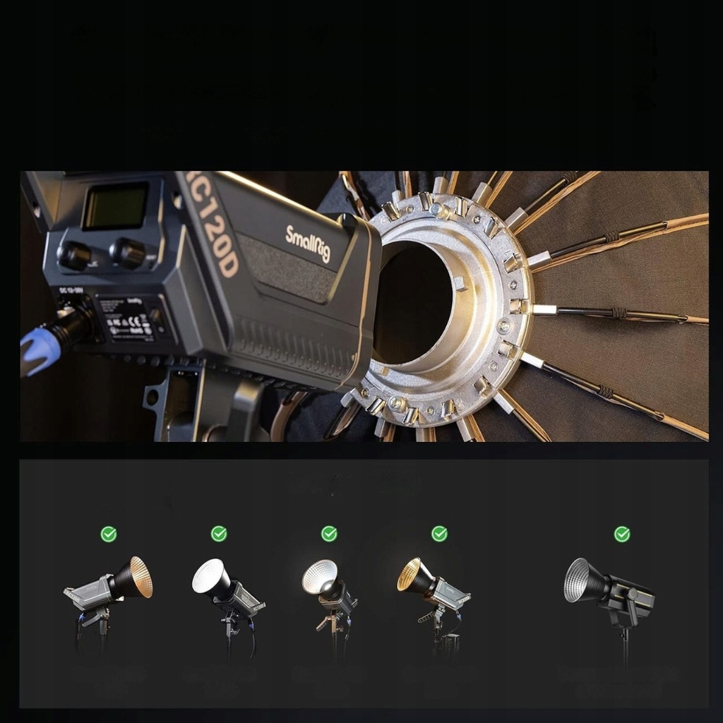 - Kompatybilność: uniwersalna konstrukcja mocowania Bowens zapewnia kompatybilność z modelami SmallRig RC 120D, RC 120B, RC 220D, RC 220B oraz innymi urządzeniami wyposażonymi w mocowanie Bowens.