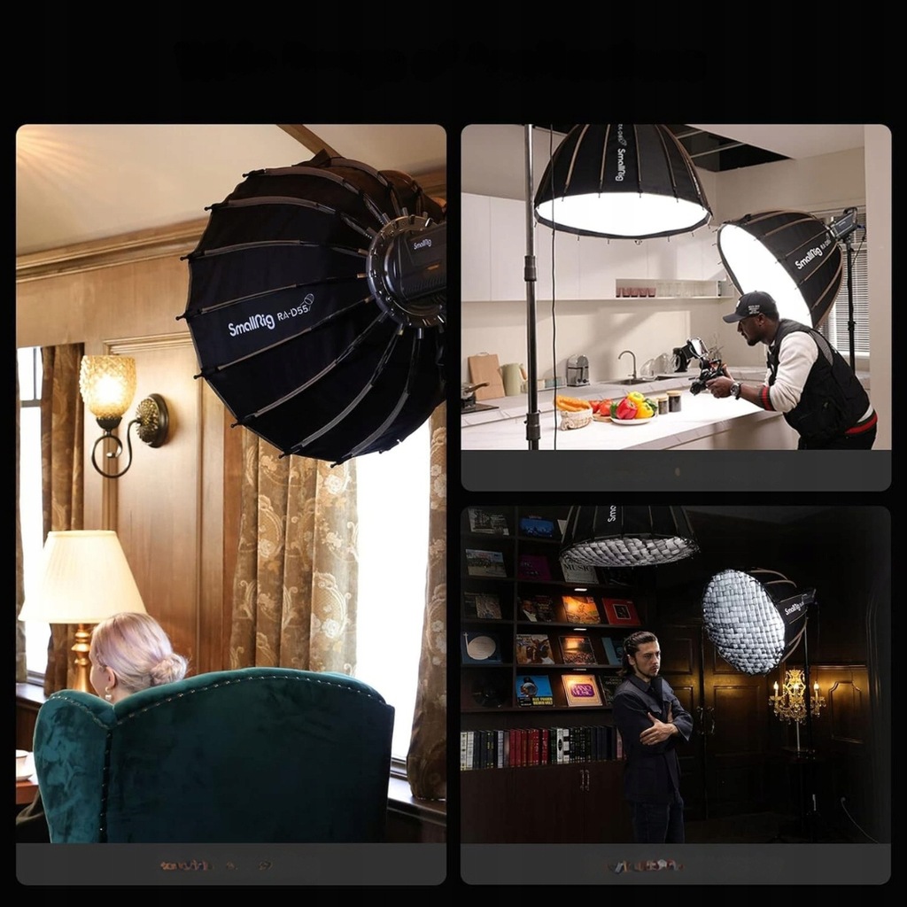 - Wymiary: SmallRig RA-D55 Parabolic Softbox to uniwersalne miękkie akcesorium o średnicy 55 cm i wadze zaledwie 1 kg. Zapewnia wszechstronne zastosowanie oraz niezawodną jakość światła, idealną do transmisji na żywo, vlogów, ślubów, filmów dokumentalnych oraz reklam telewizyjnych.