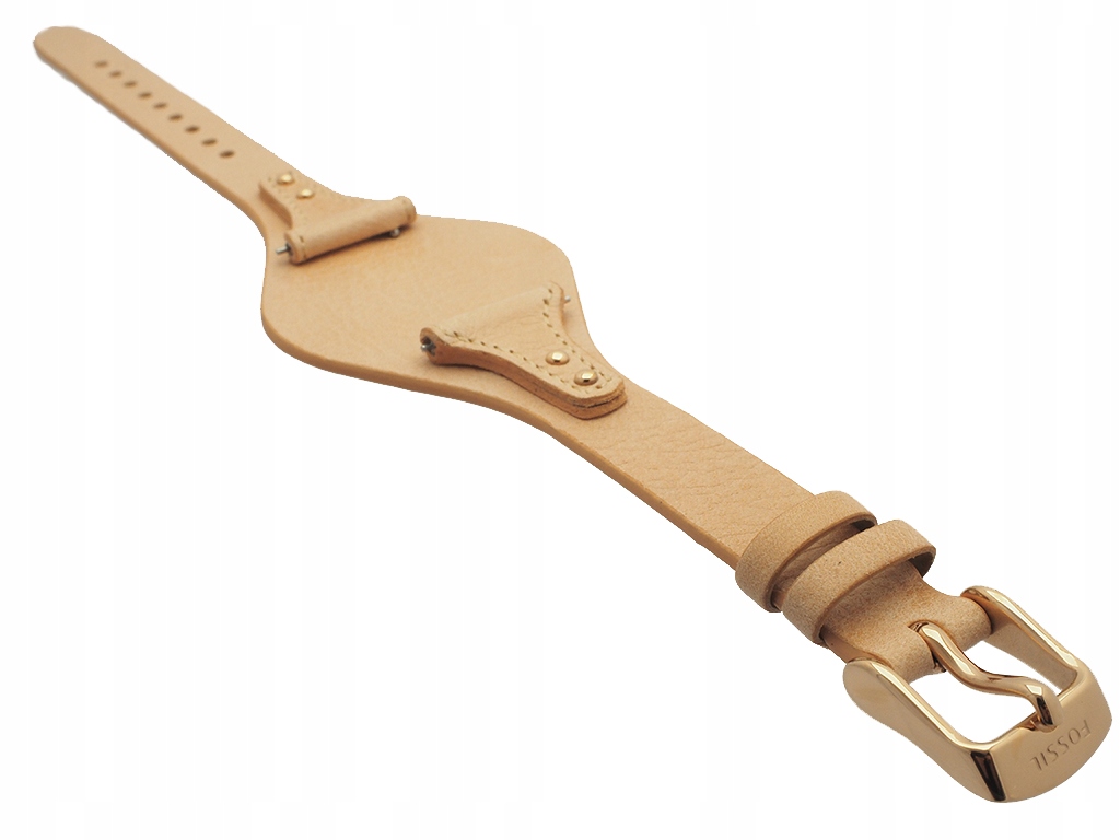 Oryginalny pasek do zegarka marki Fossil Boyfriend do modelu ES3748 wykonany ze skóry naturalnej w kolorze beżowym, z podkładką, sprzączka wykonana ze stali nierdzewnej w kolorze różowego złota. Na pasku ozdobne ćwieki w kolorze różowego złota.