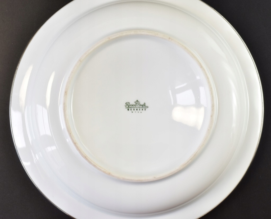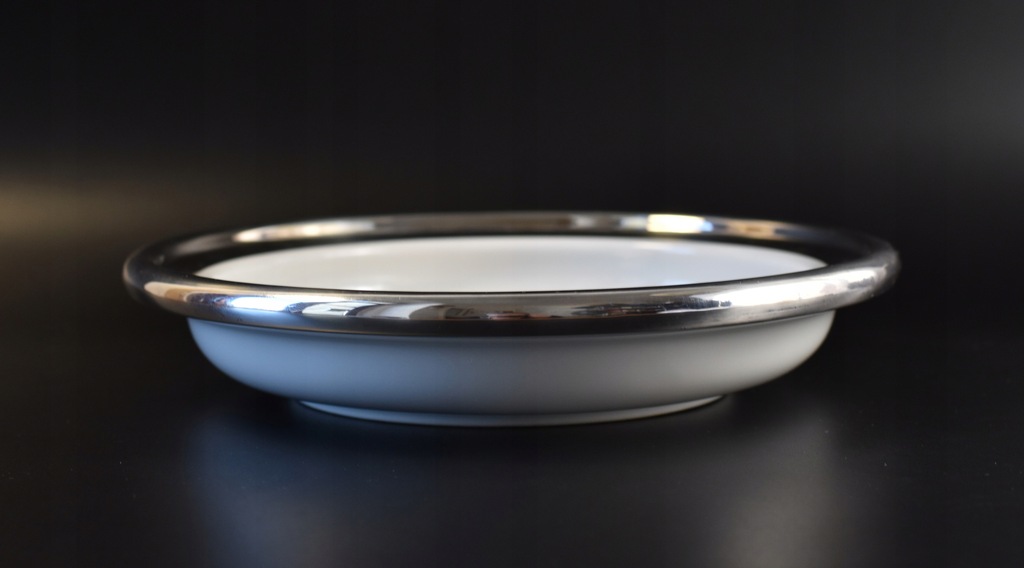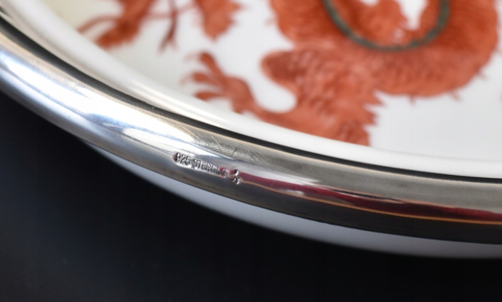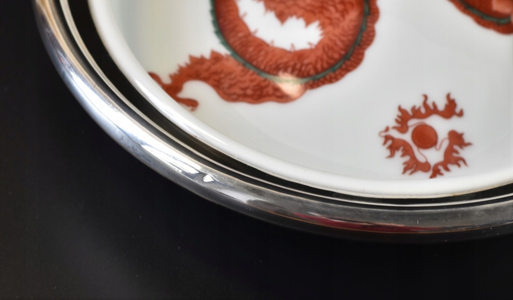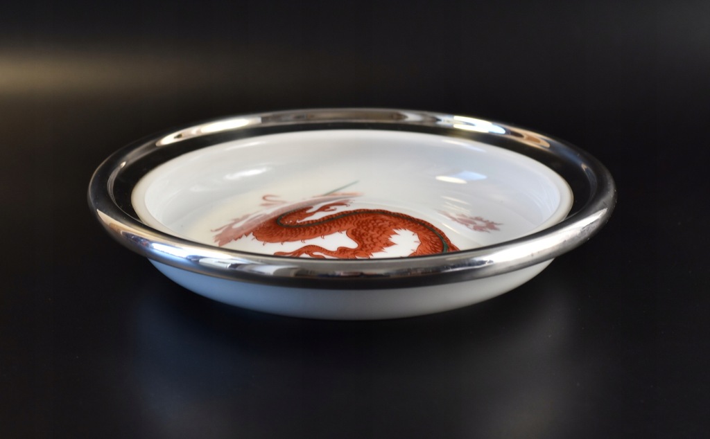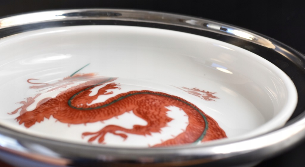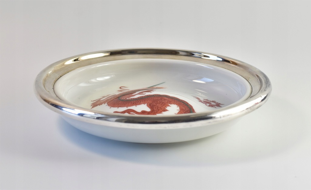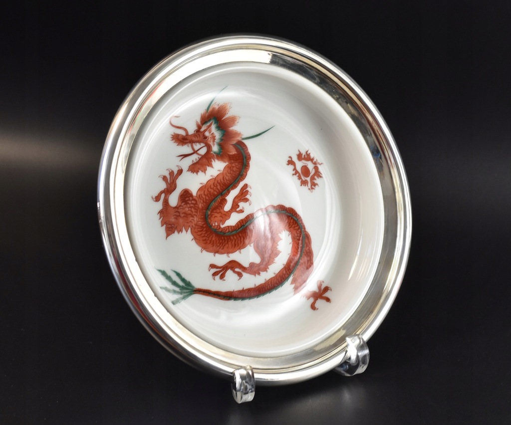 Ozdobna patera ze znanej niemieckiej manufaktury Rosenthal. Porcelana zdobiona motywem czerwonego smoka. Rant okuty srebrem w próbie 925 sterling. Patera posiada w środku wybrzuszenie, nie jest płaska.