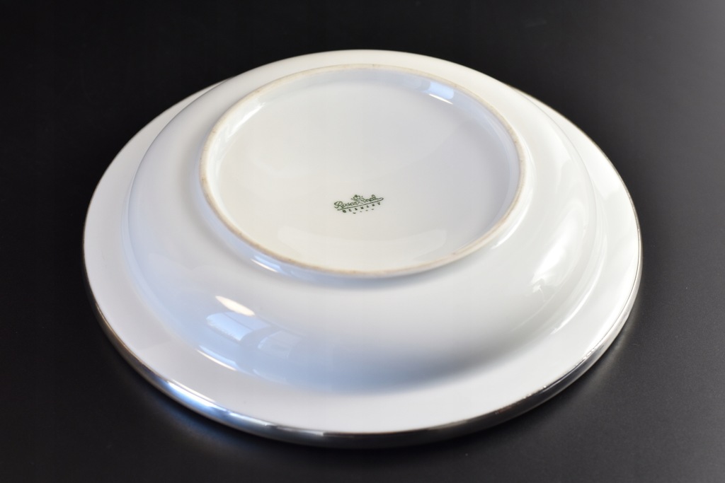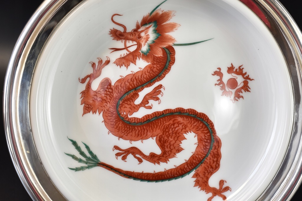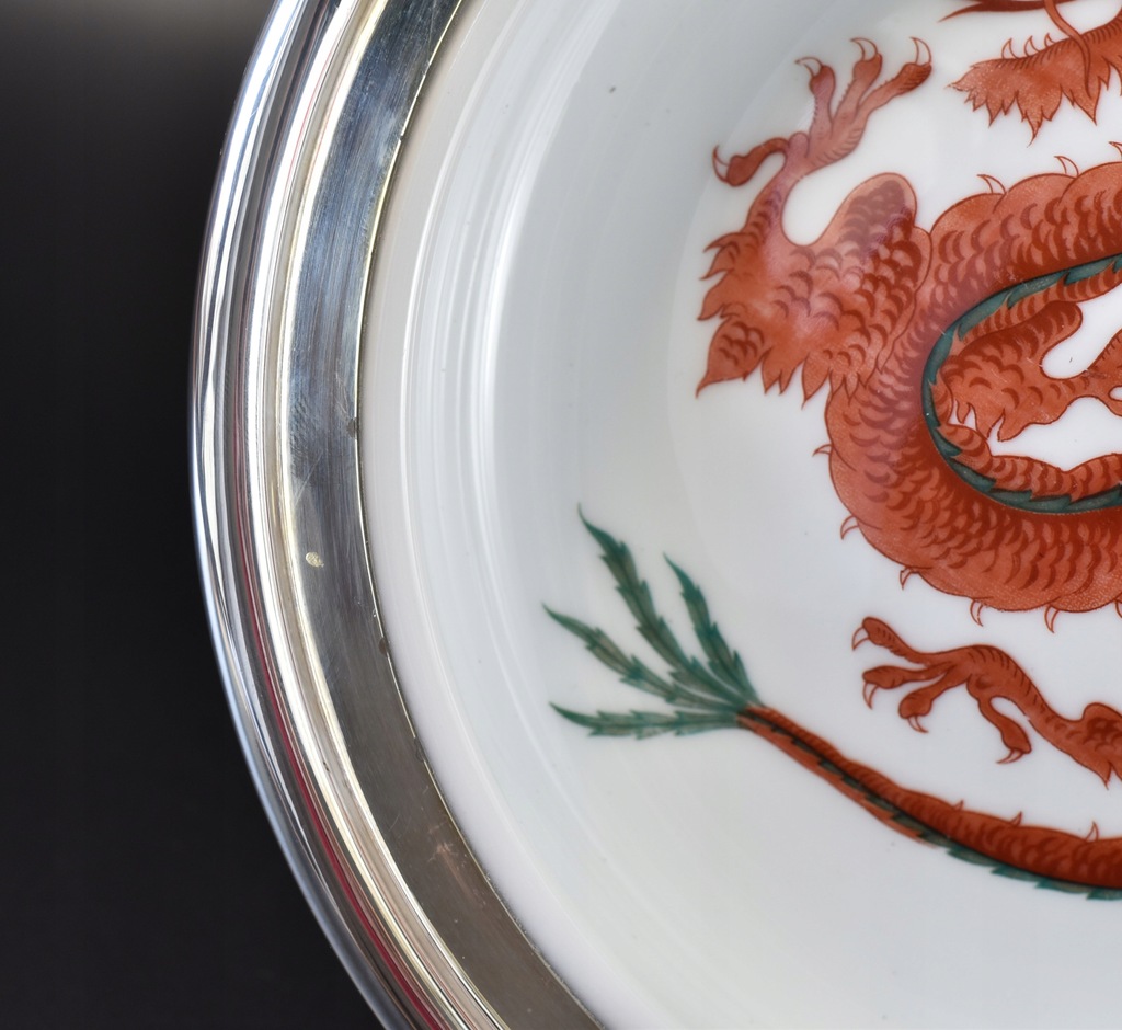 Ozdobna patera ze znanej niemieckiej manufaktury Rosenthal. Porcelana zdobiona motywem czerwonego smoka. Rant okuty srebrem w próbie 925 sterling. Patera posiada w środku wybrzuszenie, nie jest płaska.