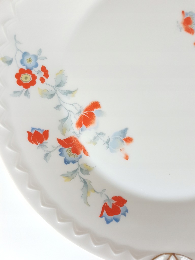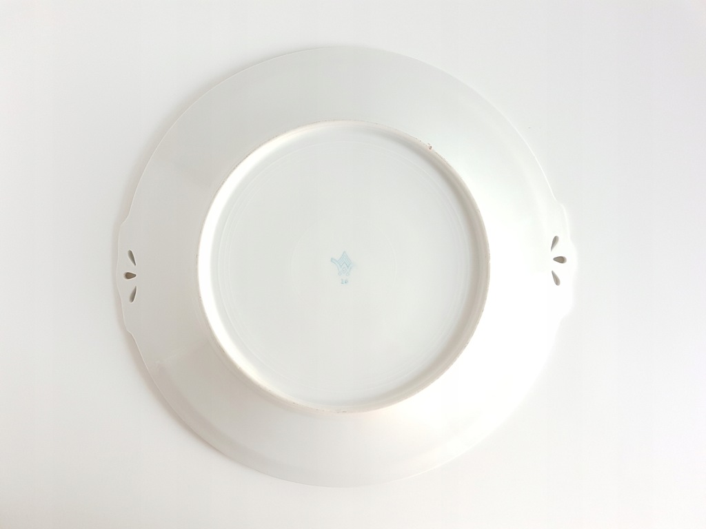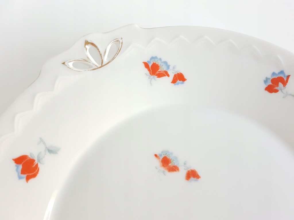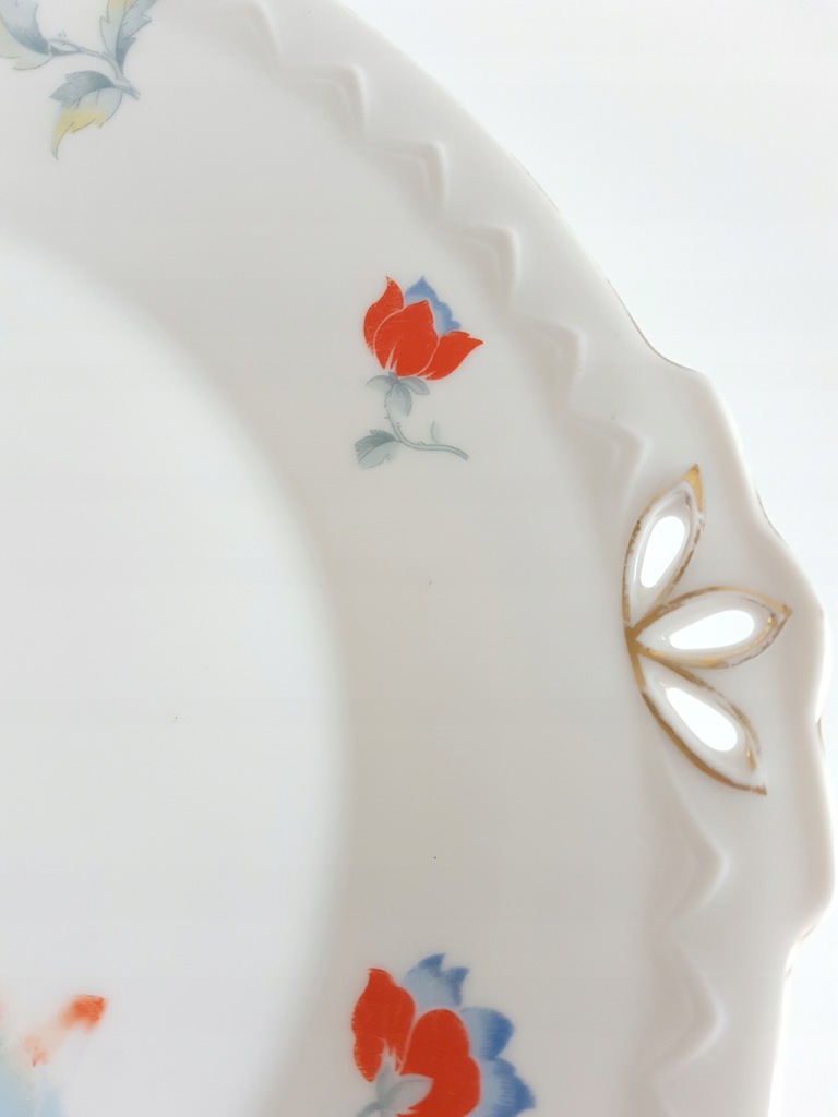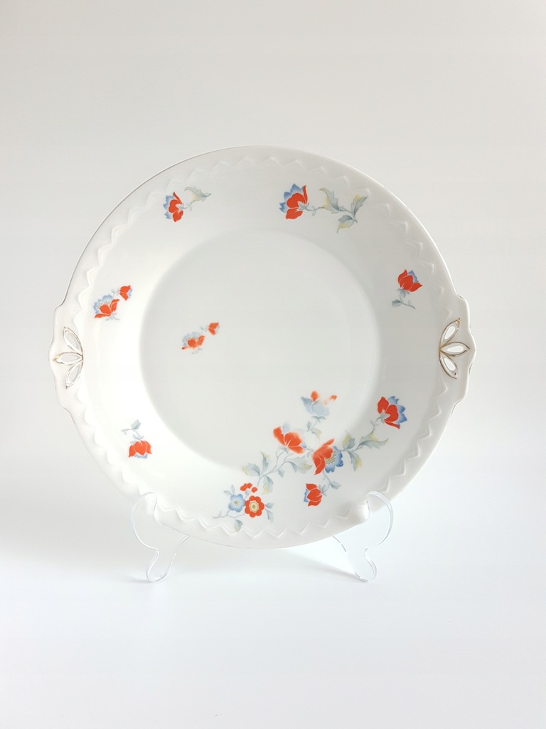Patera art deco zdobiona czerwono-niebieskimi kwiatkami i delikatnym reliefem w bordiurze. Patera pochodzi z manufaktury Sorau (dzisiejsze Żary). Sygnowana rzadko występującym znakiem datowanym na lata 1930 - 1939.