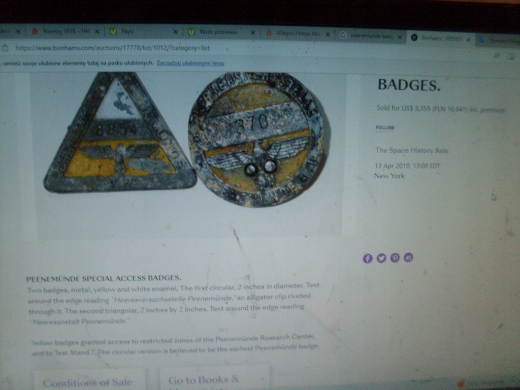 JAK W TYTULE CAŁA PIEKNA ODZNAKA IDENYFIKATOR PEENEMÜNDE SPECJALNE ODZNAKA DOSTĘPU. odznaka, metalowa, żółto-biała emalia. okrągła, o średnicy 2 cali. Wokół krawędzi widniał napis „Heeresversuchsstelle Peenemünde”, Żółte plakietki zapewniały dostęp do zastrzeżonych stref Centrum Badawczego Peenemünde i stanowiska testowego 7. Uważa się, że wersja okrągła jest najwcześniejszą plakietką Peenemünde