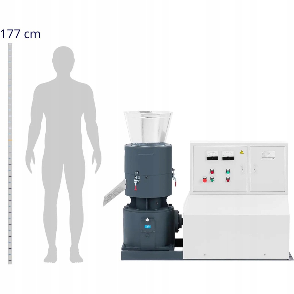 Peleciarka marki Wiesenfield pozwala wyprodukować do 1100 kg paszy w granulkach na godzinę. Przetwarza też zrębki drzewne do 450 kg/h. Umożliwia przygotowanie pelletu z trocin i palenie w piecu w sposób przyjazny dla środowiska. Peleciarkę należy podgrzać od 60 do 80°C za pomocą próżniowej obróbki cieplnej. Dzięki temu powierzchnie nie ulegają uszkodzeniu ani deformacji podczas ogrzewania. Następnie należy użyć masy do wytłoczenia. Masywny walec przepycha zawartość przez matrycę o średnicy 400 mm. W rezultacie powstaje mocno sprasowany, wytrzymały pellet o średnicy 6 mm. Aby produkować pellet o innej średnicy, potrzebne są inne matryce. Rynna wyrzutowa pozwala napełnić gotowym pelletem worki. Szafa sterownicza jest przejrzysta i intuicyjna w obsłudze. Wyłącznik awaryjny zapewnia bezpieczeństwo. Peleciarka ma silnik elektryczny o mocy 30000 W. Urządzenie jest zasilane prądem 3-fazowym 400 V i dostarczamy je bez wtyczki przyłączeniowej.