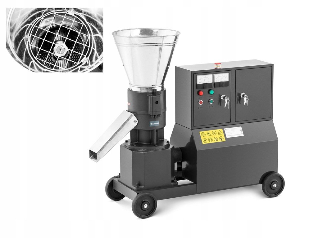 Profesjonalna peleciarka przemysłowamarki Wiesenfield służy do produkcji pelletu, paszy dla zwierząt i granulatu z różnych materiałów organicznych. Granulator daje możliwość wykorzystania drewnianych trocin, słomy, łupin orzechów, łusek ryżowych czy papieru. Są one umieszczane wspecjalnej matrycy z otworami ośrednicy 6 mm, gdzie poddaje się je działaniu wysokiego ciśnienia itemperatury (60-80C). Część materiałów wymaga użycia specjalnych spoiw. Peleciarka jest w stanie wytworzyć 200-300 kg paszyoraz110-140 kg pelletu z trocinw ciągu godziny. Nad ochroną użytkownika czuwa specjalny hamulec bezpieczeństwa. 4 kółka zapewniająmobilność maszyny oraz ułatwiają transportowanie.
