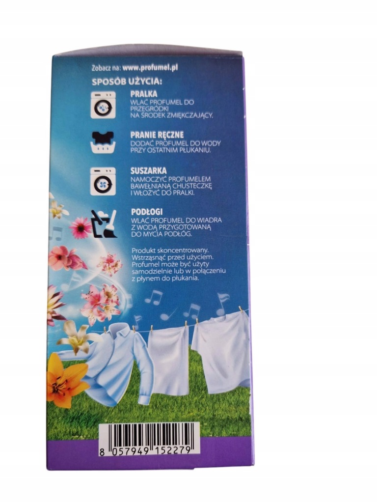 PRALKA Wlać Profumel do przegródki na płyn zmiękczający. Może być użyty samodzielnie lub z płynem do płukania.