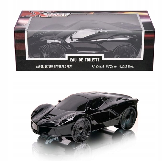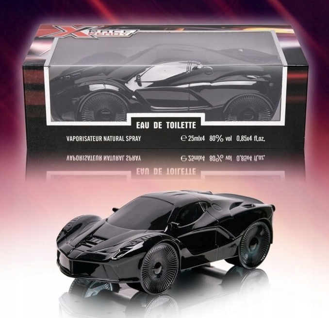 Produkt posiada flakonik w kształcie eleganckiego czarnego sportowego samochodu, wszystko zapakowane w stylowym kartoniku prezentowym. Szklane opony przyciągają wzrok a w nich dwa różne zapachy, dwa na dzień i dwa na wieczór.
