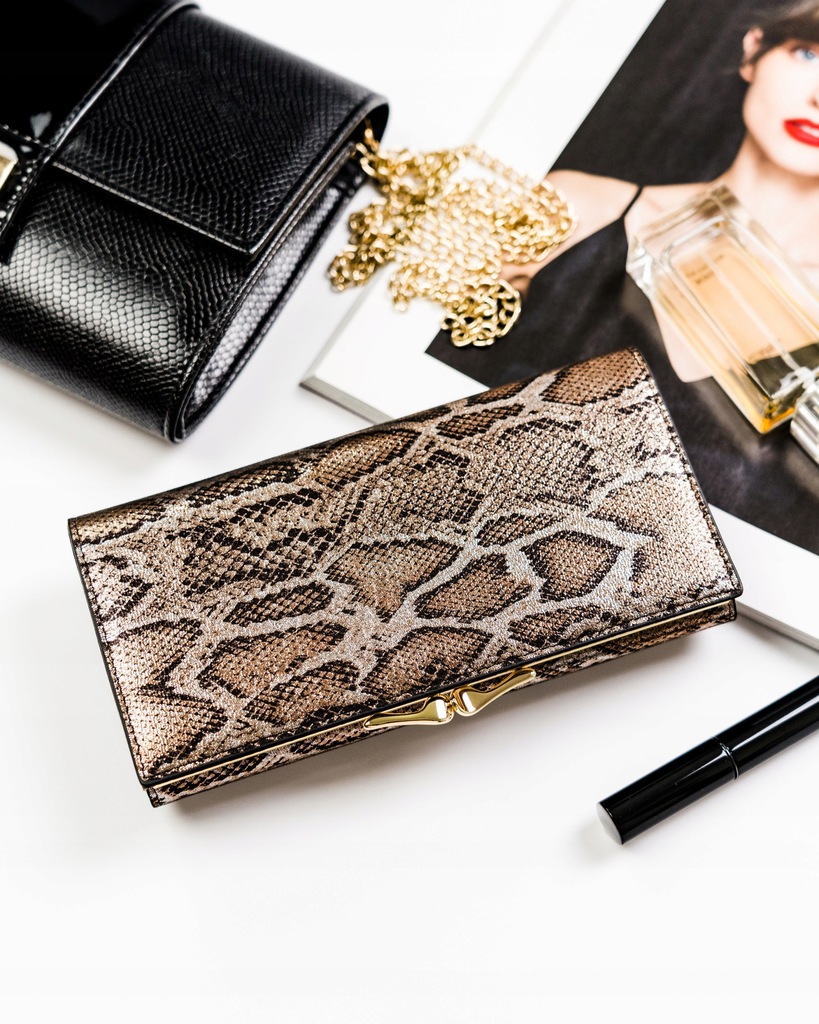 #️⃣ Modny wzór | Portfel o klasycznej stylistyce imitujący skórę węża. Model w orientacji poziomej zapinany na zatrzask