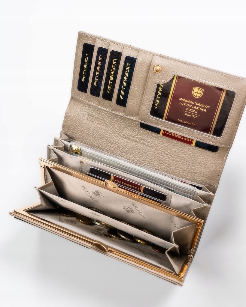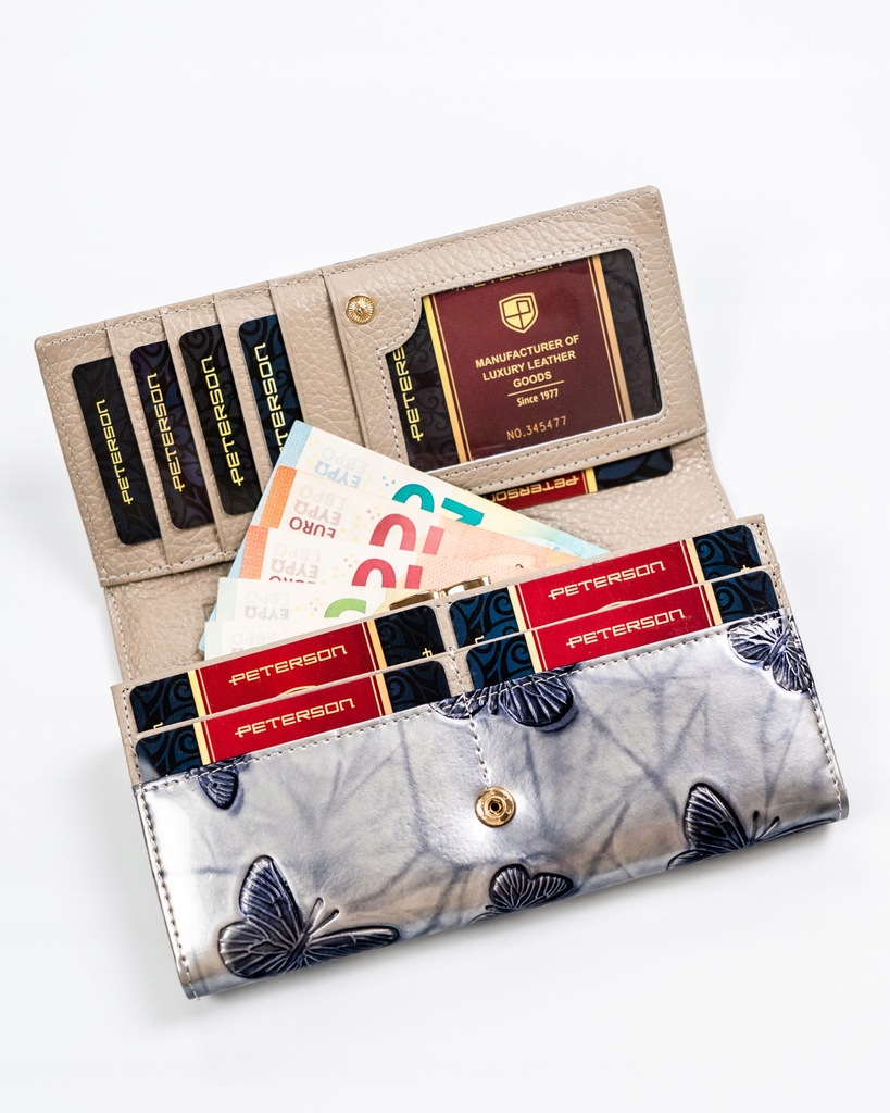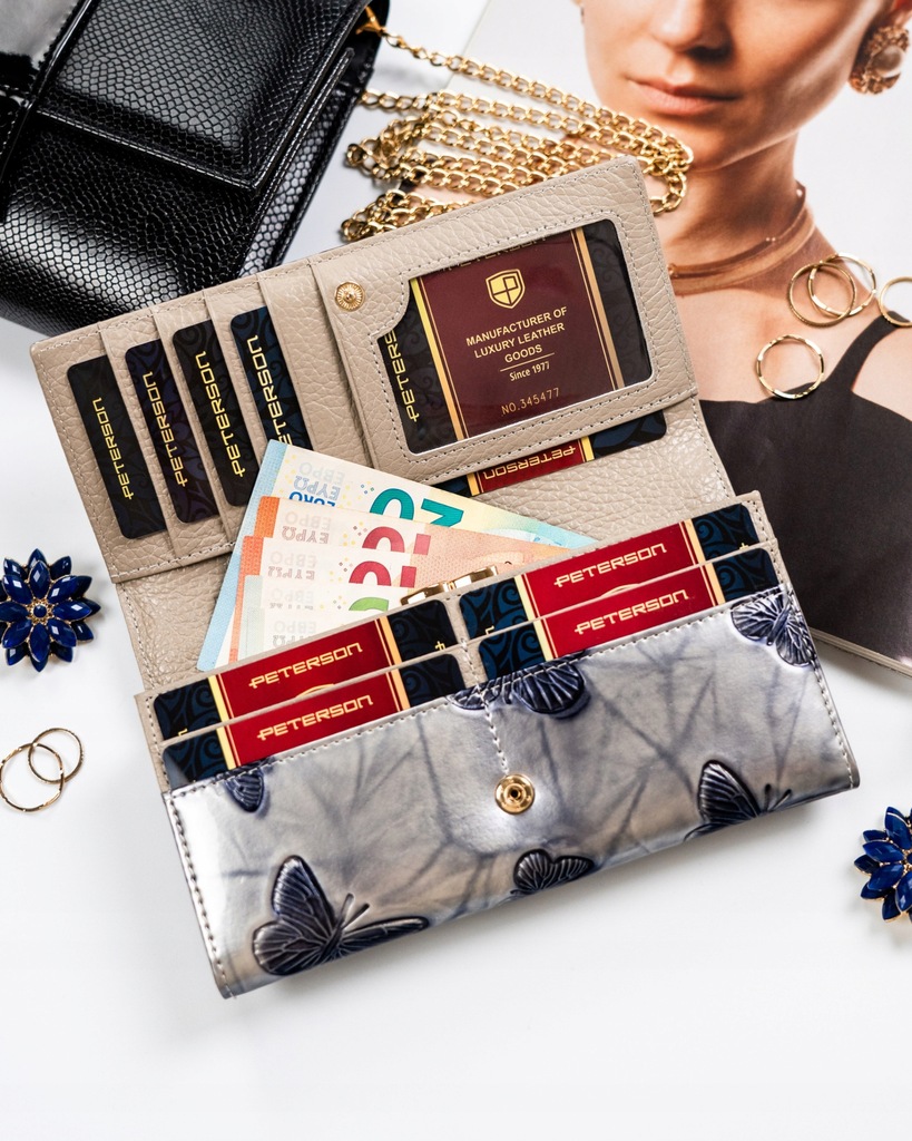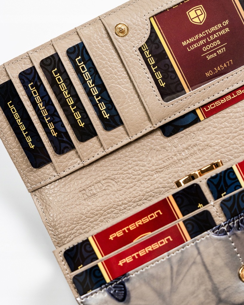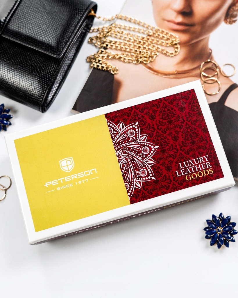 Galanteria marki Peterson® cieszy się ogromną popularnością. Każdy produkt projektowany jest zgodnie z aktualnie obowiązującymi trendami, nawiązując do oryginalnej i ponadczasowej stylistyki. Bogactwo kolorów i wzorów, jak również wysoka jakość wykonania to cechy, które charakteryzują markę.