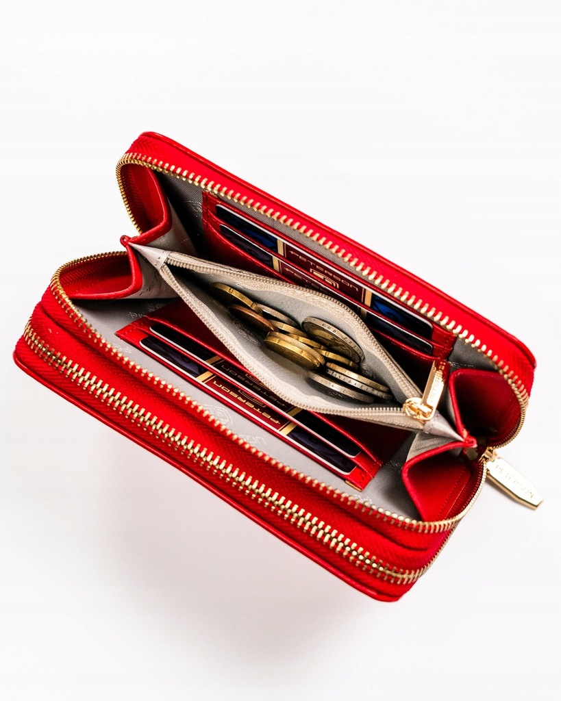 Portfel dwukomorowy zapinany na zamki błyskawiczne. Po jego otwarciu mamy dostęp do pojemnych sekcji, która pomieści: