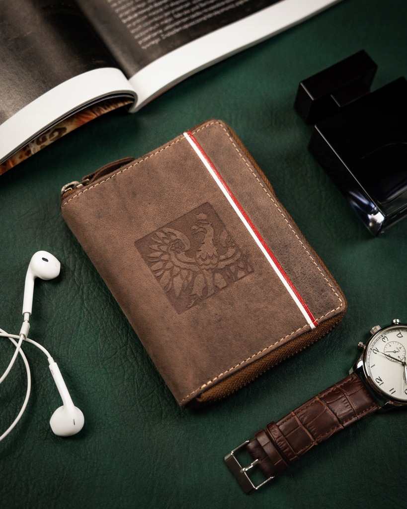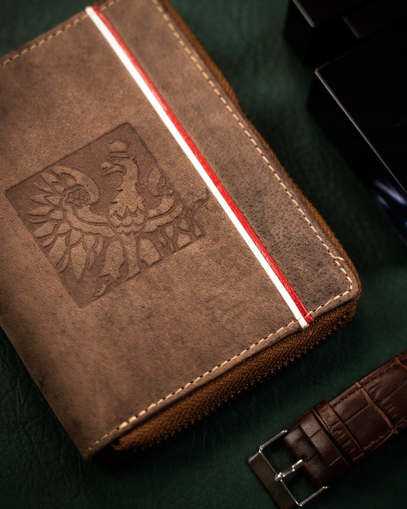 #️⃣ Patriotyczny design | Portfel o klasycznej stylistyce. Model w orientacji pionowej zapinany w całości na zamek. Na froncie widnieje tłoczony wzór przedstawiający godło Polski