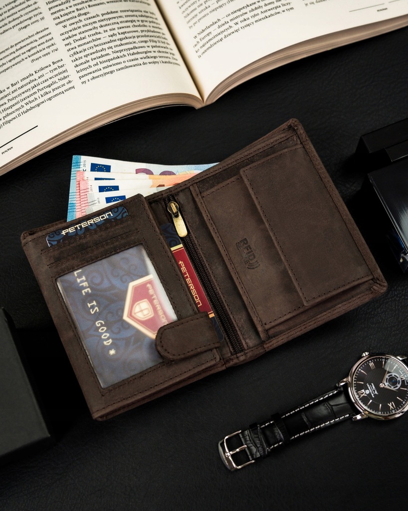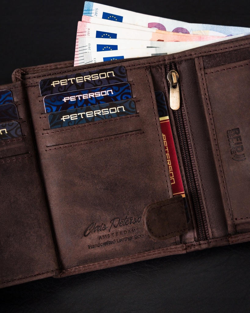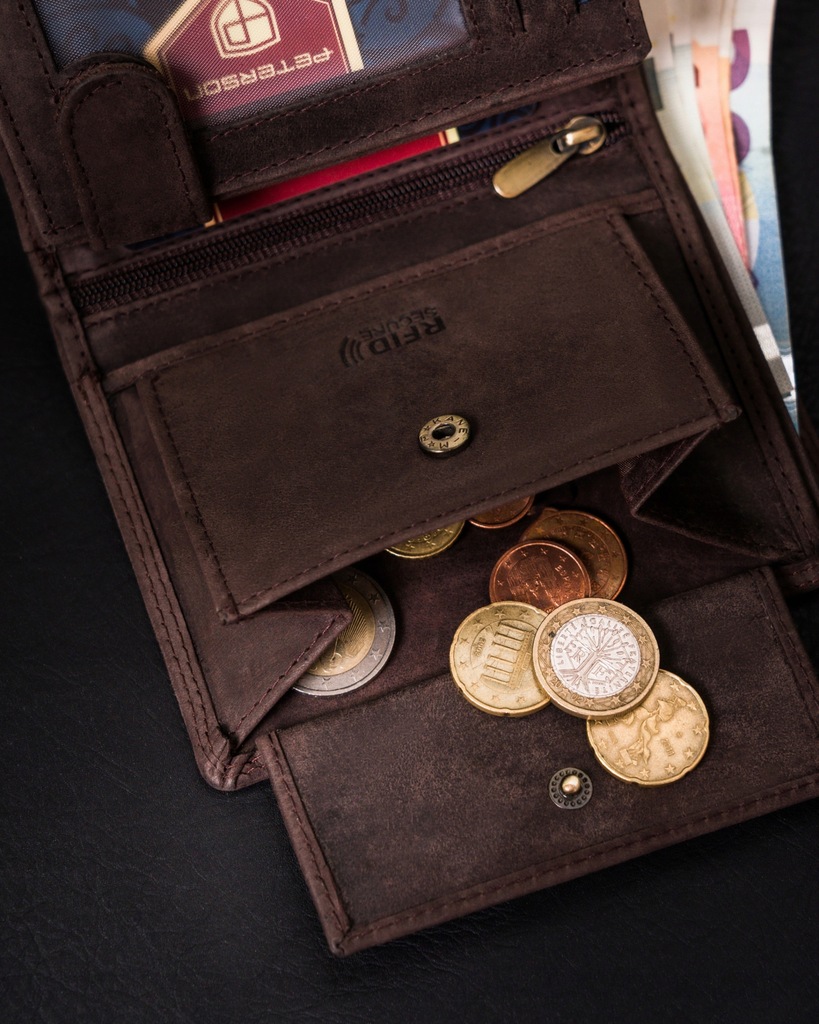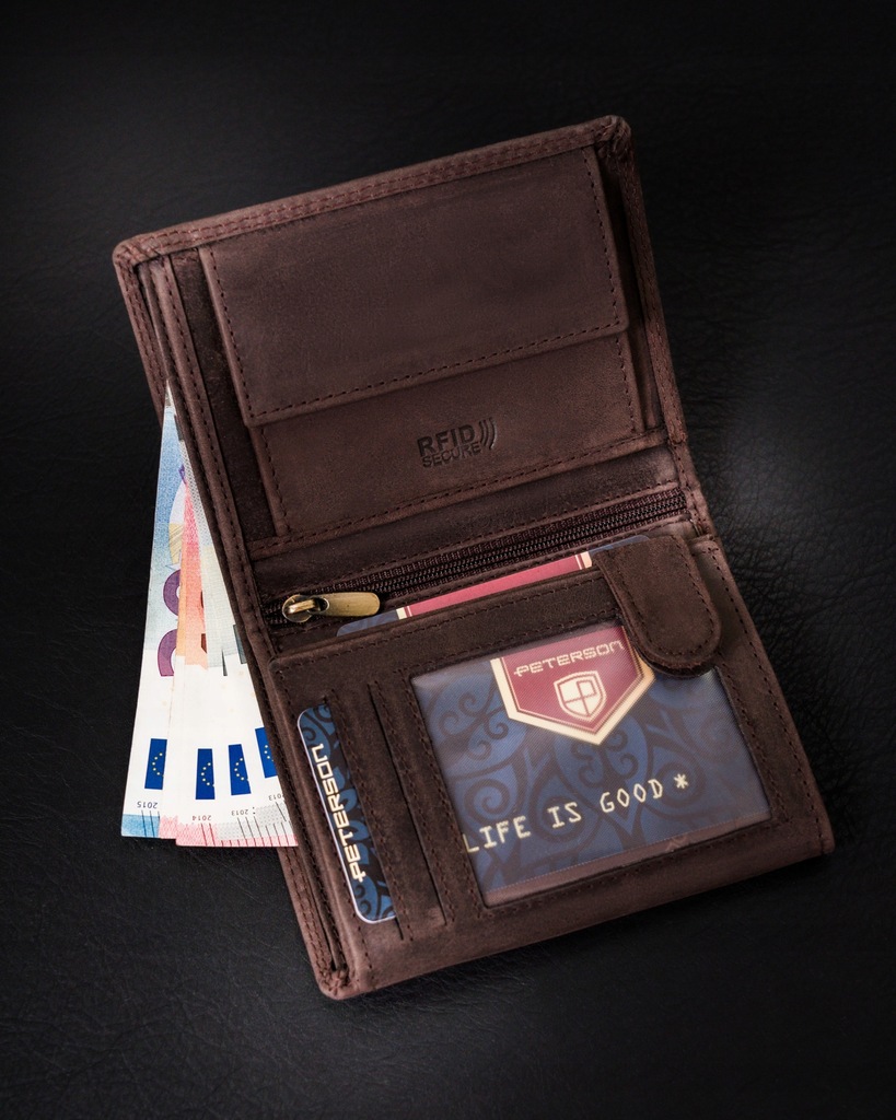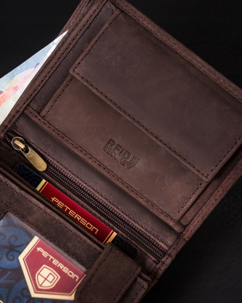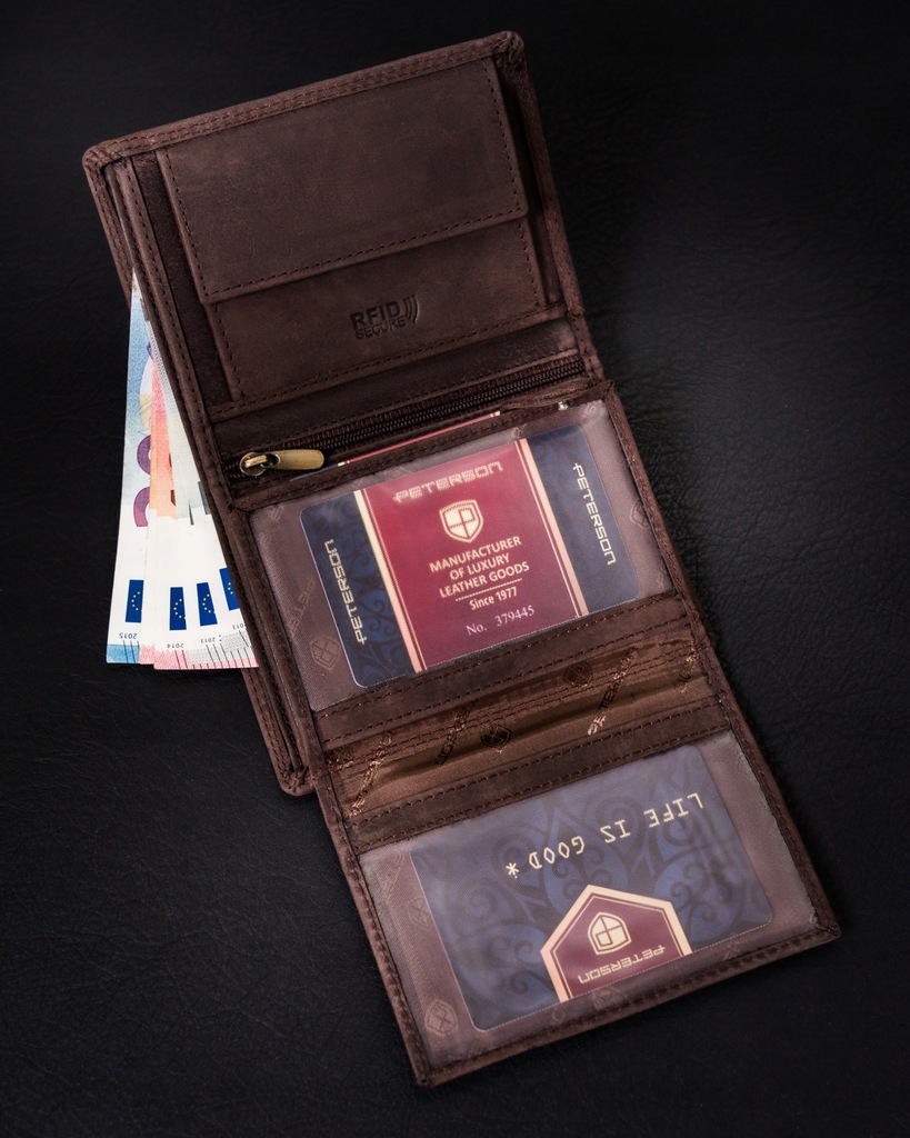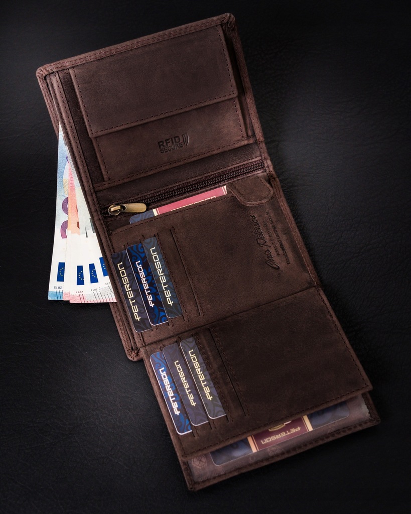 Portfel wyposażony w specjalną podszewkę z RFID BLOCKING SYSTEM (Radio-Frequency IDentification), która zabezpiecza karty zbliżeniowe, dokumenty biometryczne, legitymacje i karty komunikacji miejskiej przed nieautoryzowanym odczytem danych. Technologia uniemożliwia odczyt danych za pomocą specjalnych czytników wykorzystywanych do kradzieży danych.