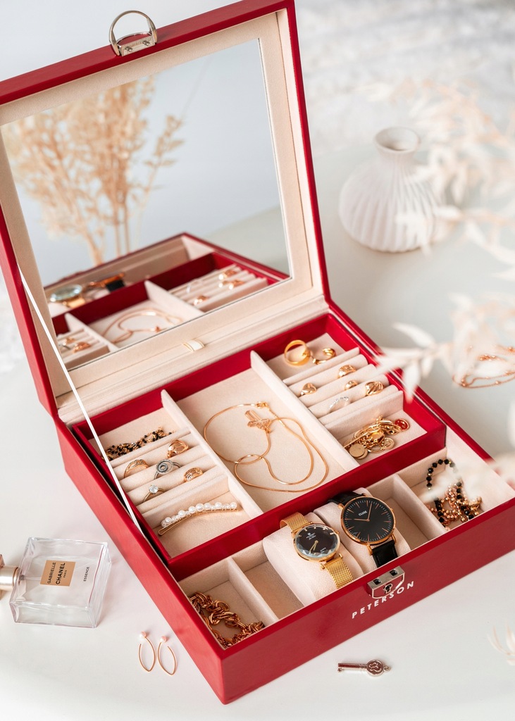 W środku znajduje się małe etui, które w każdej chwili możesz wyciągnąć! To praktyczny sposób, aby zabrać ze sobą ulubioną biżuterię w podróż. Etui wyposażone jest w małe lusterko oraz przegródki do segregacji biżuterii.