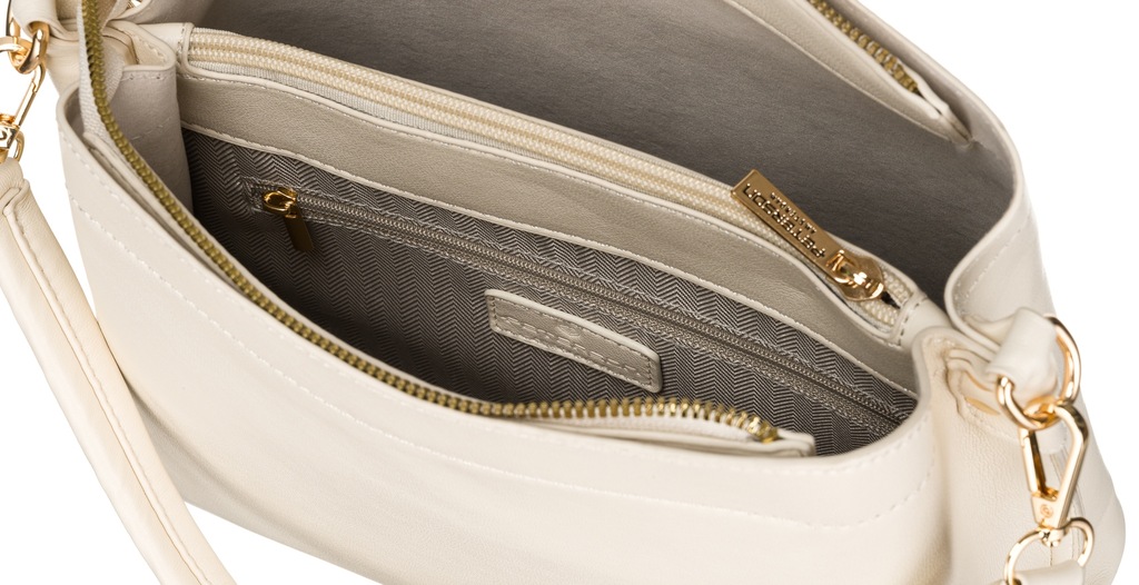 Torebka ma 1️⃣ podwójną komorę, którą przedziela przegródka na suwak. Dodatkowo wyposażona jest w zamykaną kieszonkę. Całość na materiałowej podszewce, która chronić będzie eko skórę przed uszkodzeniami podczas wkładania i wyjmowania z niej przedmiotów.