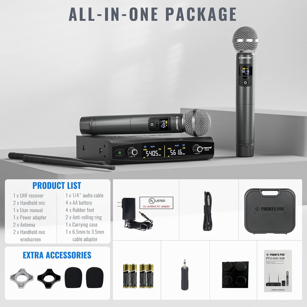 Phenyx Pro Mikrofon bezprzewodowy system mikrofonowy z walizką, bezprzewodowy zestaw mikrofonowy do śpiewu, karaoke, kościoła, 2 x 30 UHF regulowane częstotliwości, zasięg 200 stóp (PTU-52)