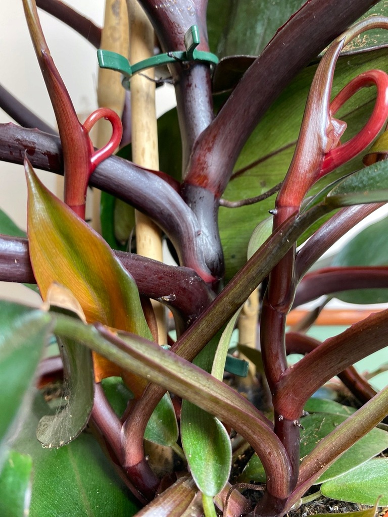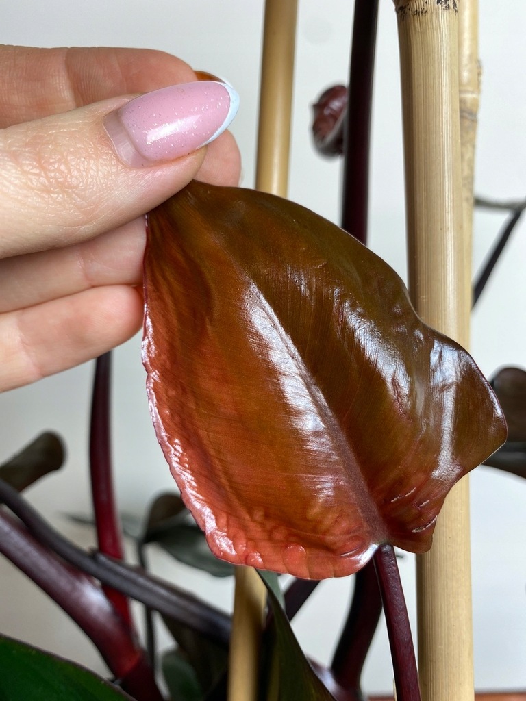 Cechuje go szlachetna, czerwieniejąca kolorystyka skórzastych liści. Każdy dostrzeże tu piękny kontrast pomiędzy zielenią, a brązem i czerwienią, które przechodzą się wzajemnie, a także kolorem rubinowym ogonków liściowych, który wnosi do każdego pomieszczenia w którym roślina stanie, wyjątkowy klimat. To roślina do wnętrz nowoczesnych, awangardowych, jednak pomiędzy klasycznymi gatunkami roślin, również będzie wyglądać gustownie i przyciągnie wzrok. Ma nieco wydłużone liście, które są jednolite i błyszczące. Pokrój krzewiasty jednak, zgrabny. Roślina może osiągnąć nawet 2 metrów. Jako egzotyczne pnącze idealnie wygląda na podpórkach z mchu lub kokosa.