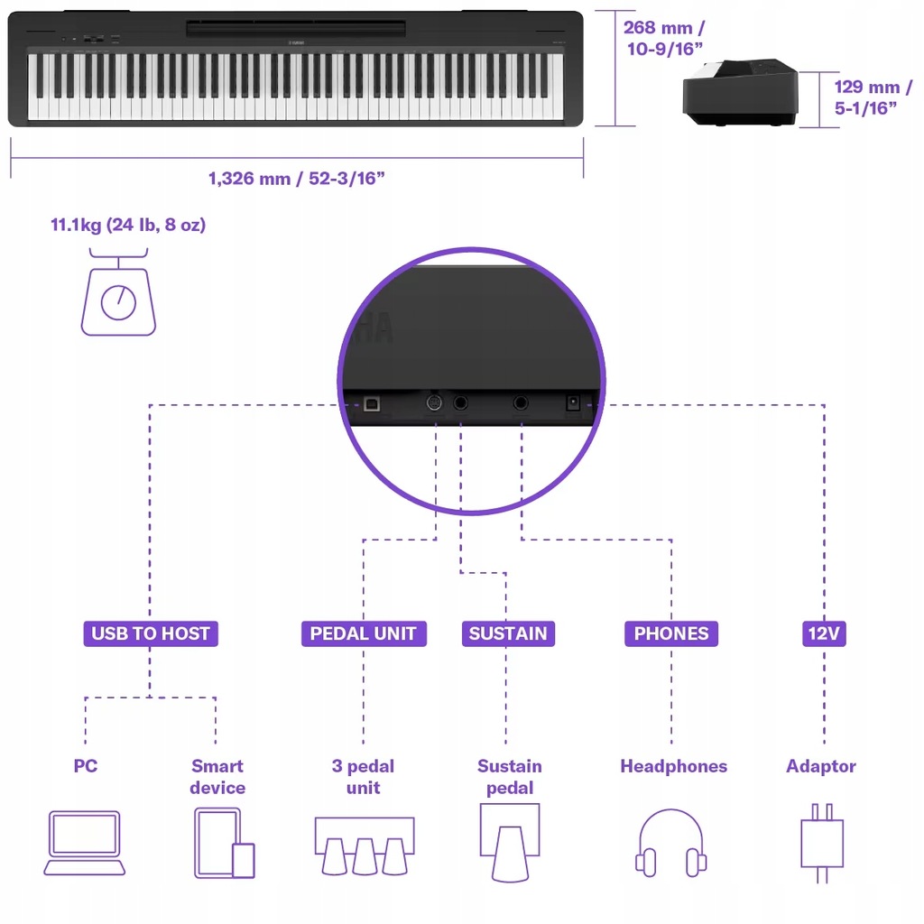 - Akcesoria sprzedawane oddzielnie Słuchawki (HPH-150, HPH-100, HPH-50), podstawka pod klawiaturę (L-100), moduł pedału (LP-5A), pedał nożny (FC3A), przełącznik nożny (FC4A, FC5), torba na klawiaturę (SC-KB851), zasilacz sieciowy* (PA-150B lub odpowiednik zalecany przez firmę Yamaha), bezprzewodowy adapter MIDI (UD-BT01) *Zależy od regionu
