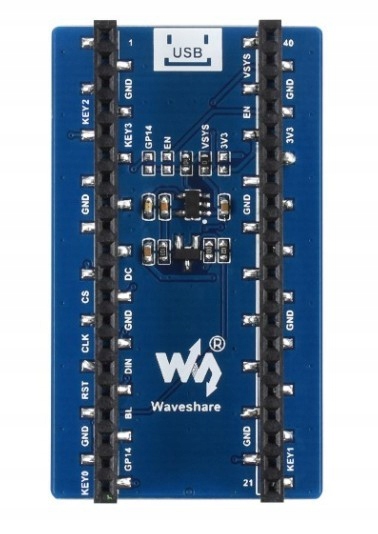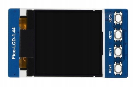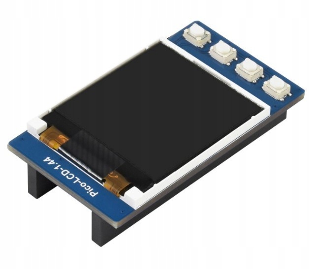 Moduł z kolorowym wyświetlaczem LCD TFT o przekątnej 1,44" i rozdzielczości 128x128 px przeznaczony do współpracy z Raspberry Pi Pico. Ma wbudowany kontroler ST7735S, który realizuje komunikację za pomocą interfejsu SPI. Może wyświetlać treść w pełnej gamie kolorów 65K, a na płytce umieszczono 4 przyciski do dyspozycji użytkownika. Moduł jest kompatybilny z systemami 3,3 V oraz 5 V. Pełna dokumentacja wraz z przykładami dostępna jest na stronie Wiki produktu.