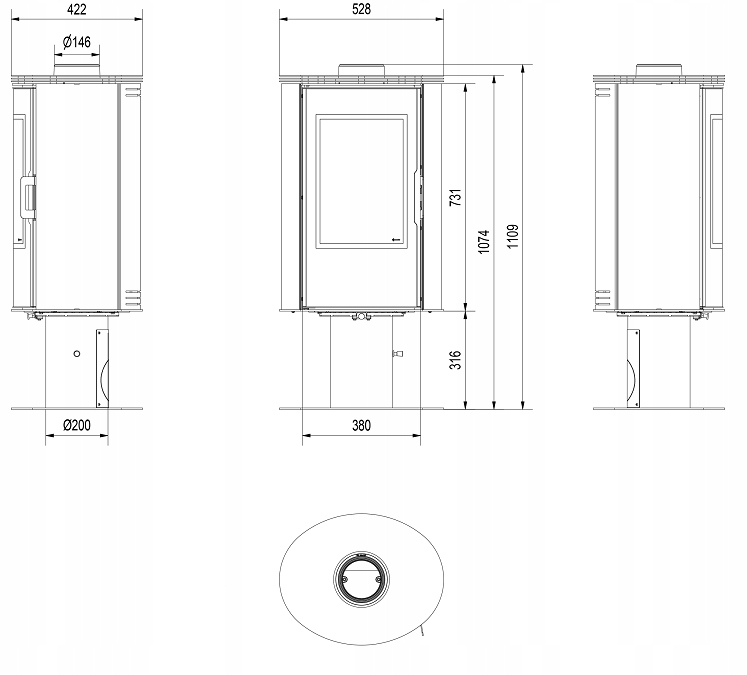 - Średnica wylotu spalin (mm): 150