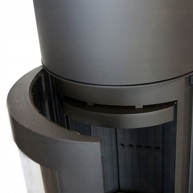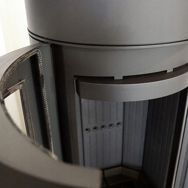 Dodatkowo w piecu zastosowany jest system czystej szyby (kurtyna powietrza), czyli powietrze dostarczane jest bezpośrednio na szybę poprzez system kanałów umieszczonych na bokach kominka. W ten sposób dostarczany jest tlen do górnej części komory spalania, w której następuje dopalanie gazów powstałych w procesie spalania drewna, co dodatkowo ogranicza emisję szkodliwego CO do atmosfery.