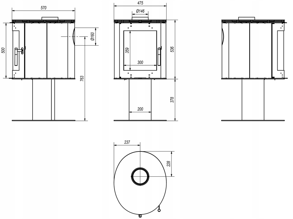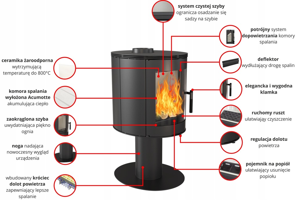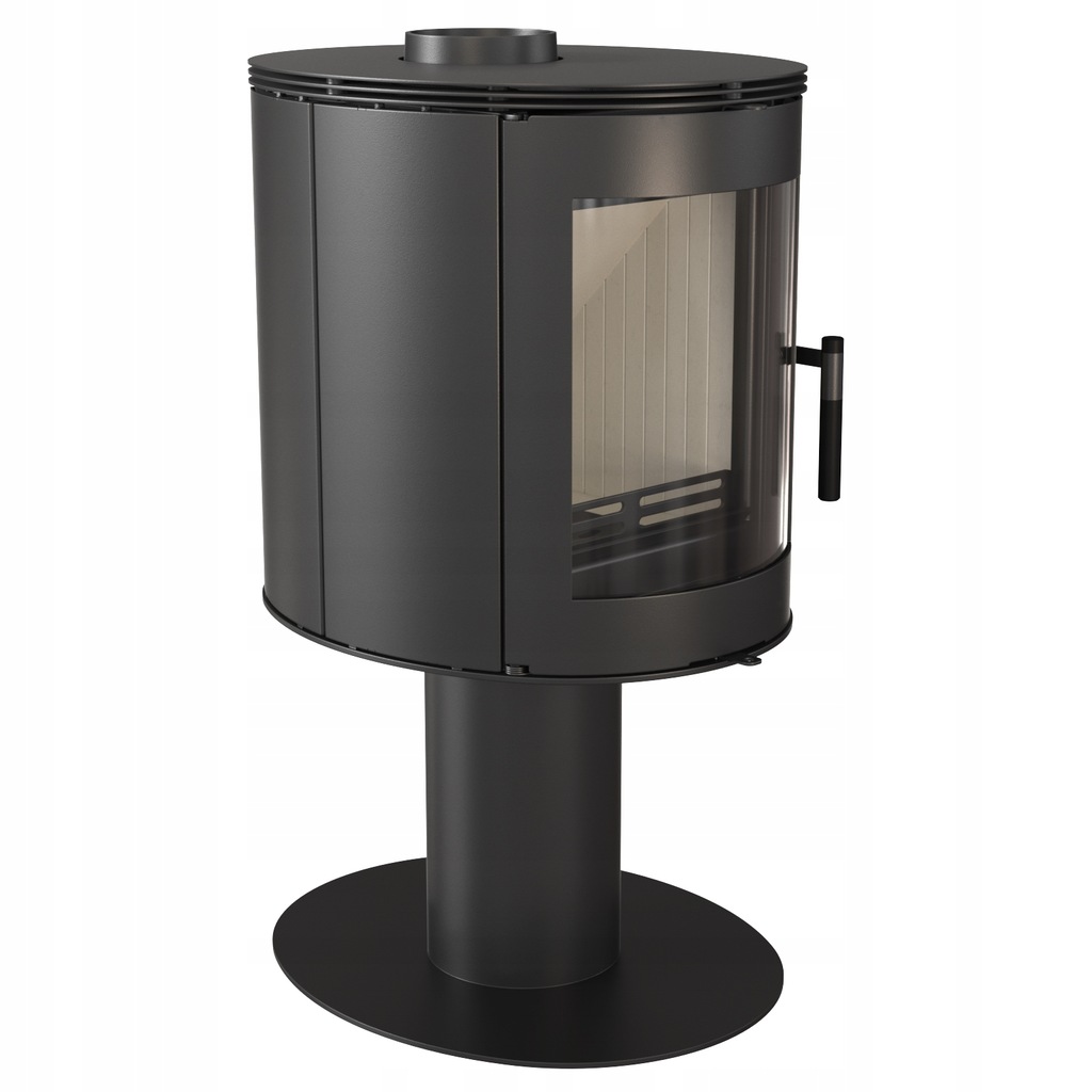 Uwydatnione piękno ognia dzięki zaokrąglonej szybie. Nowoczesny cylindryczny kształt.