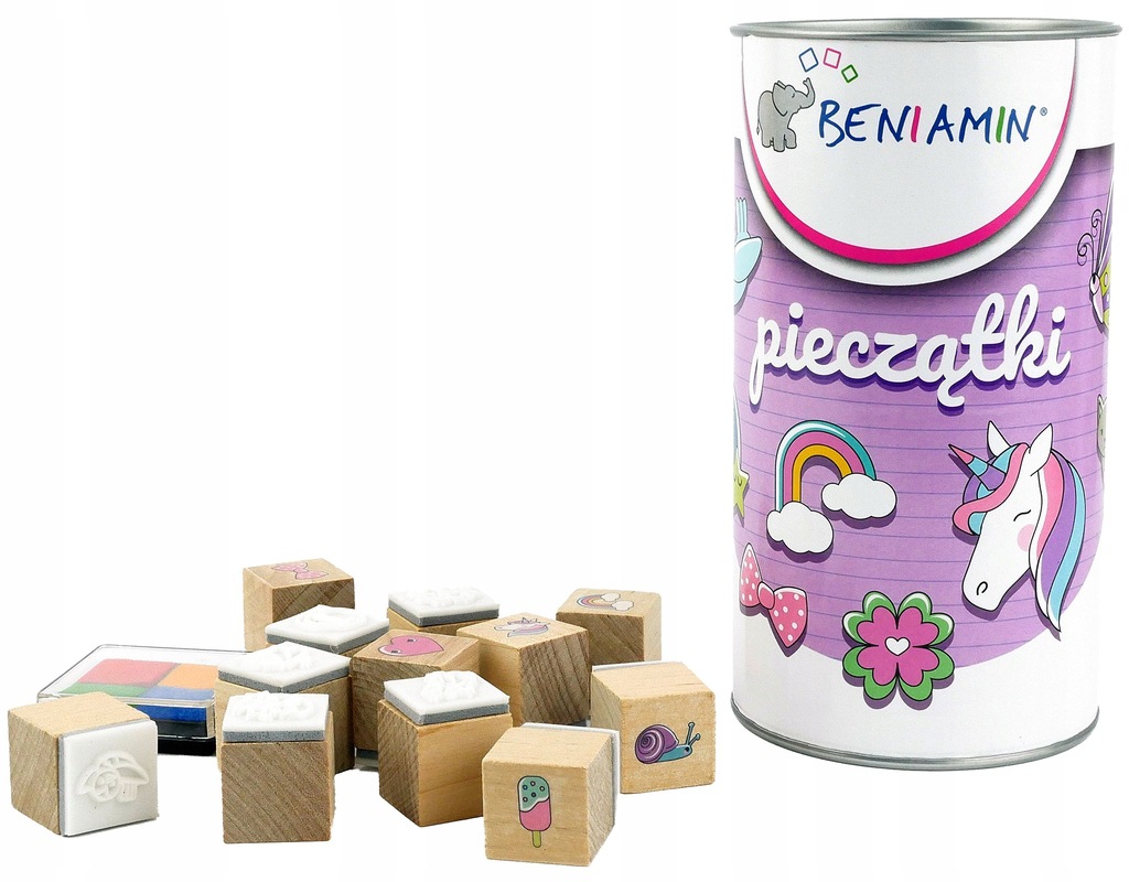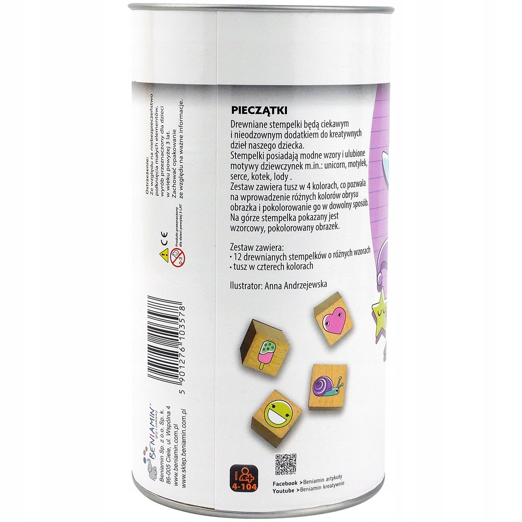 Drewniane pieczatki dla dziewczynki. Stempelki posiadają modne wzory i ulubione motywy dziewczynek np..: unicorn, motylek, serce. Zestaw zawiera tusz w 4 kolorach, co pozwala na wprowadzenie różnych kolorów obrysu obrazka i pokolorowania go w dowolny sposób. Na górze stempelka pokazany jest wzorcowy pokolorowany obrazek. Zestaw zawiera: 12 drewnianych stempelków o róznych wzorach oraz tusz w 4 kolorach.