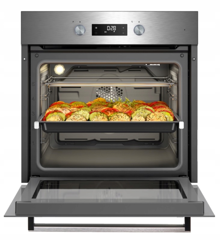 - Dodatkowe informacje: timer, miękkie domykanie drzwi, termostat, sygnał końca pieczenia, wyświetlanie czasu trwania programu, wentylator, pieczenie wielopoziomowe, zdejmowane drzwi, łatwy demontaż szyby