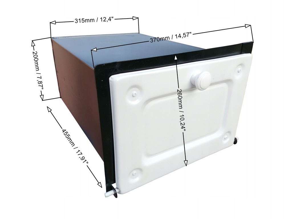 - Piekarnik do zabudowy w piecu kaflowym, uchylany, wykonany z blachy stalowej, front malowany proszkowo na kolor biały.