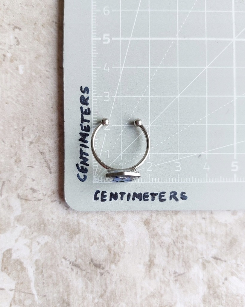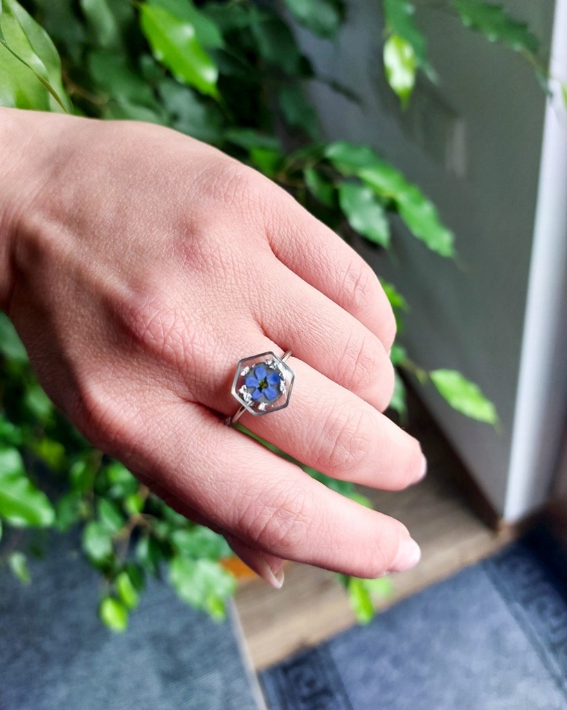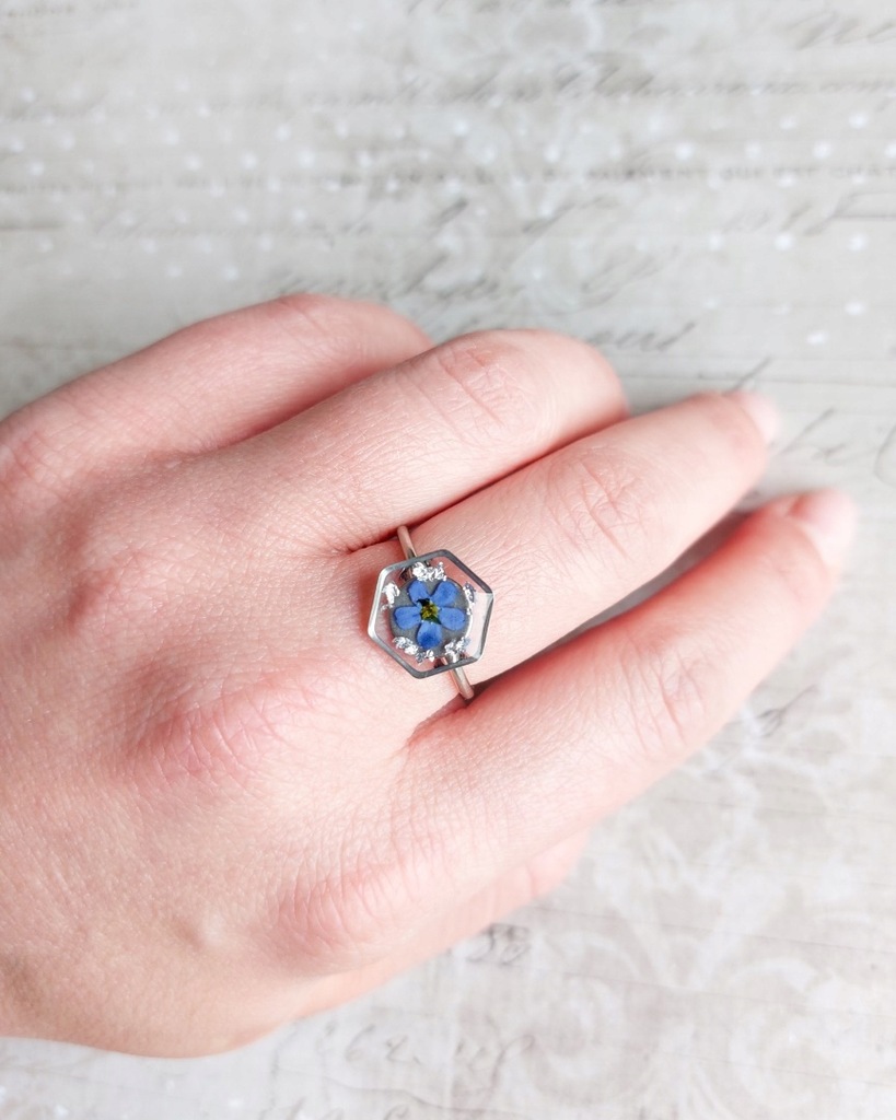 Wszystkie elementy metalowe to stal chirurgiczna w kolorze srebrnym. Pierścionek jest znakomitym dodatkiem zarówno do codziennych jak i bardziej eleganckich stylizacji. W żywicy zatopione są srebrne płatki oraz niezapominajki zebrane i wysuszone przeze mnie. Pierścionek doskonale sprawdzi się jako dodatek do codziennych stylizacji, będzie też znakomitym prezentem na przykład na urodziny dla bliskiej osoby.