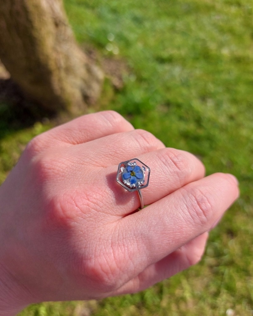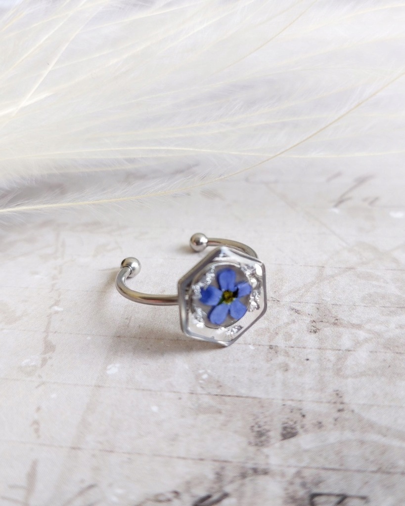 Pierścionek regulowany w kształcie sześciokąta z kwiatem niezapominajki i srebrnymi drobinkami, stal chirurgiczna.