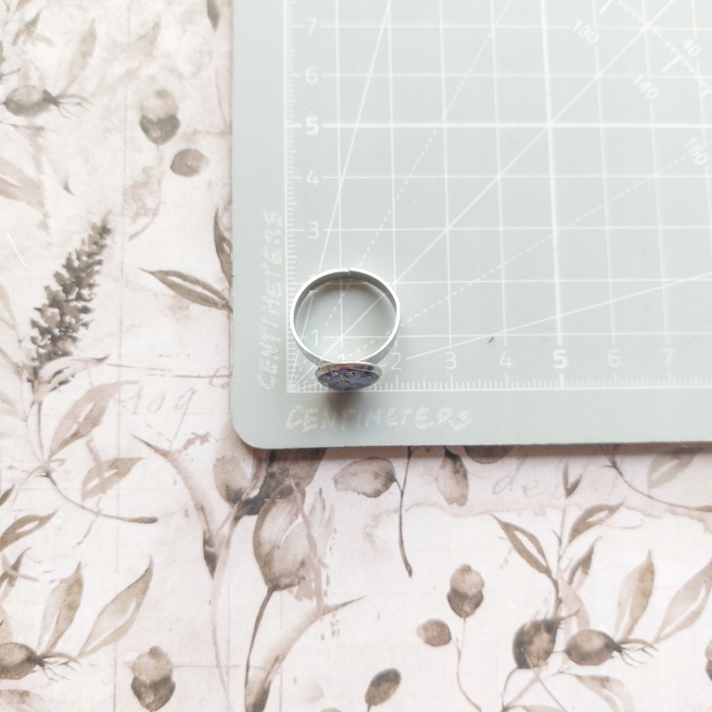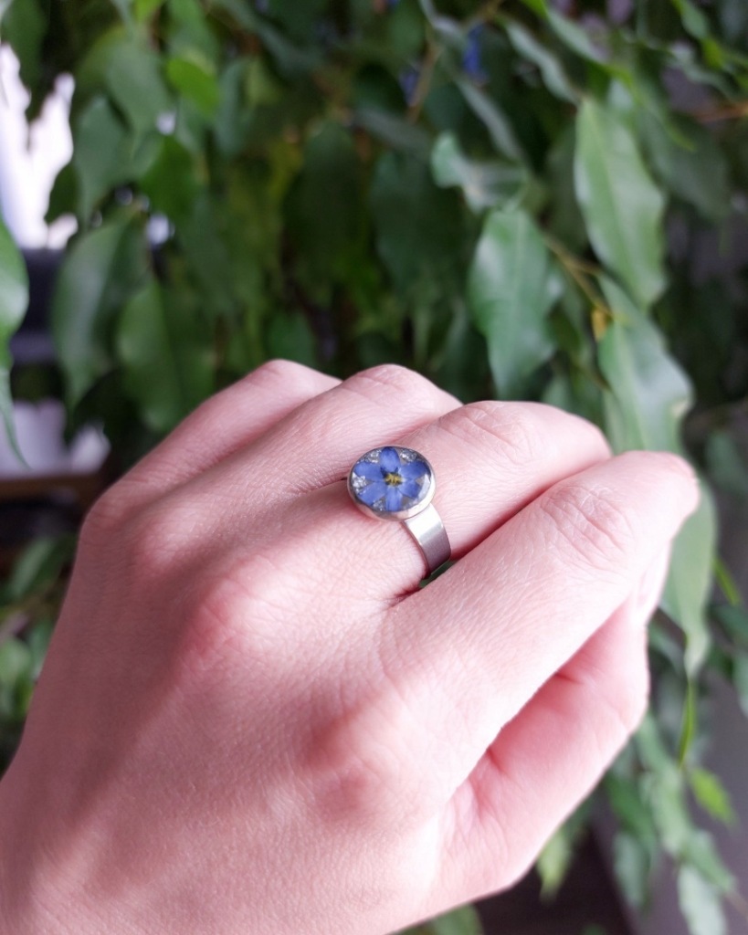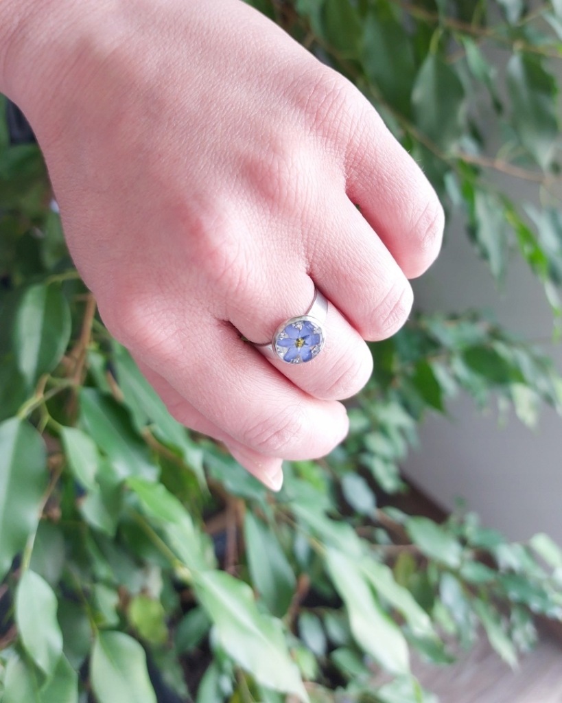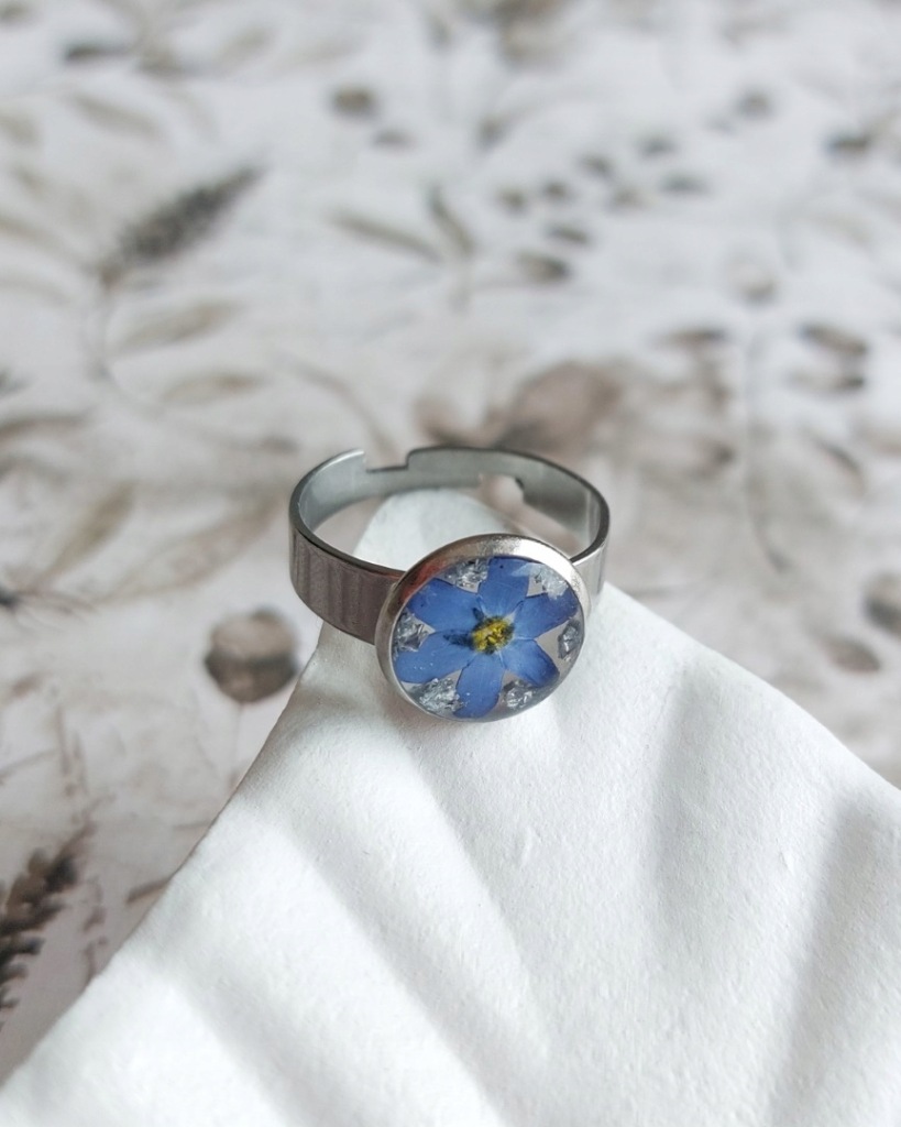 Wszystkie elementy metalowe to stal chirurgiczna w kolorze srebrnym. Pierścionek jest znakomitym dodatkiem zarówno do codziennych jak i bardziej eleganckich stylizacji. W żywicy zatopione są srebrne płatki oraz kwiat niezapominajki zebrany i wysuszony przeze mnie. Pierścionek doskonale sprawdzi się jako dodatek do codziennych stylizacji, będzie też znakomitym prezentem na przykład na urodziny dla Córki.