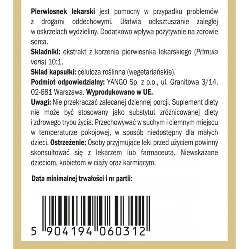 Składniki: Ekstrakt z korzenia pierwiosnka lekarskiego (Primula veris) 10:1. Skład kapsułki: Celuloza roślinna (wegetariańskie).